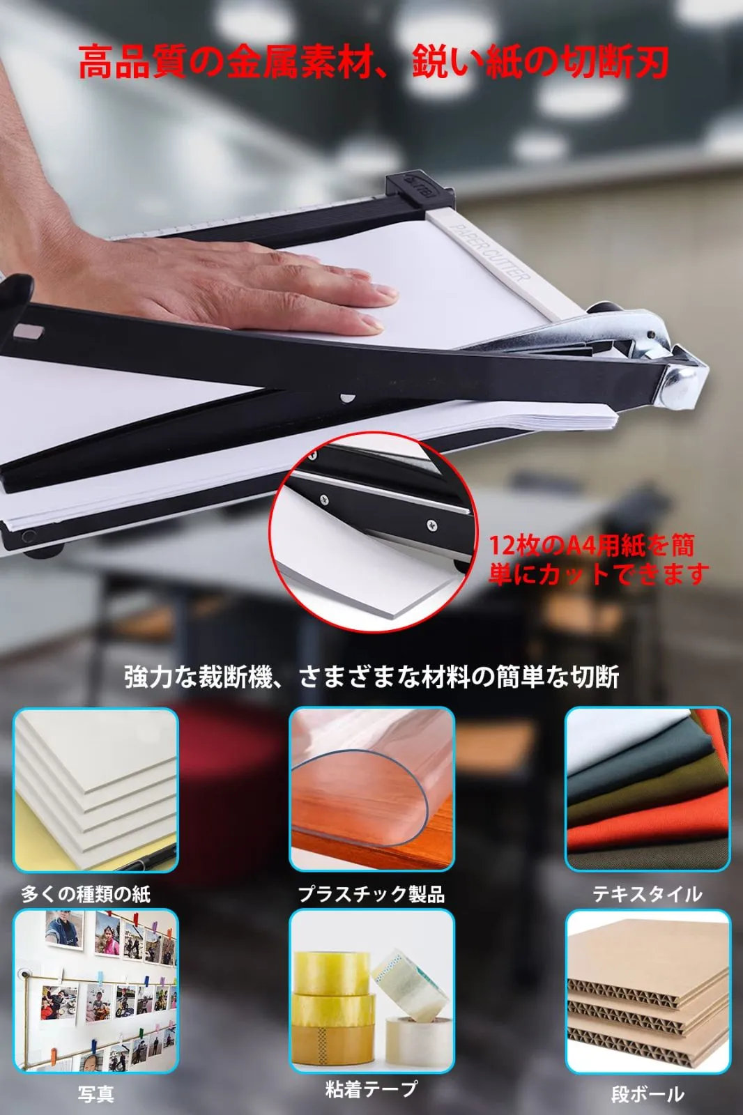 【プレミアム素材、シャープなカット】裁断機高品質のスチール製、高品質、シャープなエッジ、カットしやすい紙、最大12枚までカットできます。 テキスタイル、プラスチック、テキスタイル、写真、段ボールなどもカットできます。 オフィスでの使用に最適です。