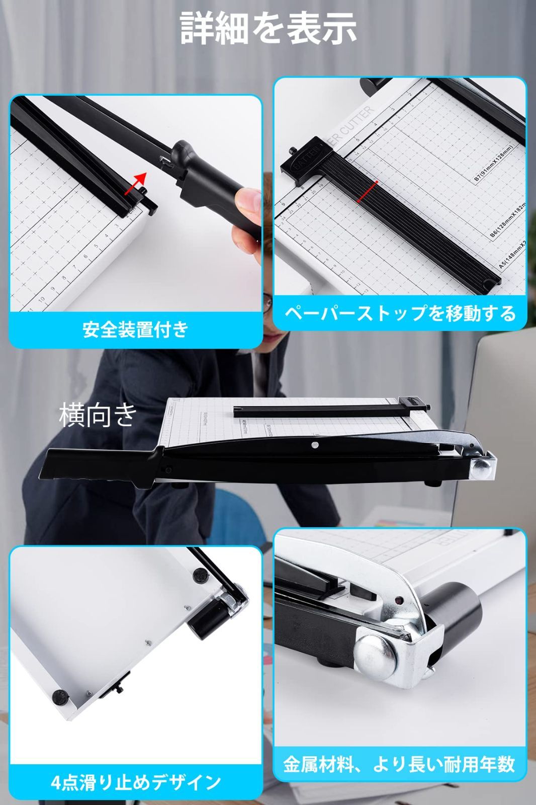 【さらに安心の安全設定】裁断機には安全ロックが装備されており、使用しないときは刃を固定できます。 ハンドルは人間工学に基づいて設計され、握りやすい形状になっています。 ベースには、使用中の滑りを防止するための滑り止めスペーサーが 4 つあります。