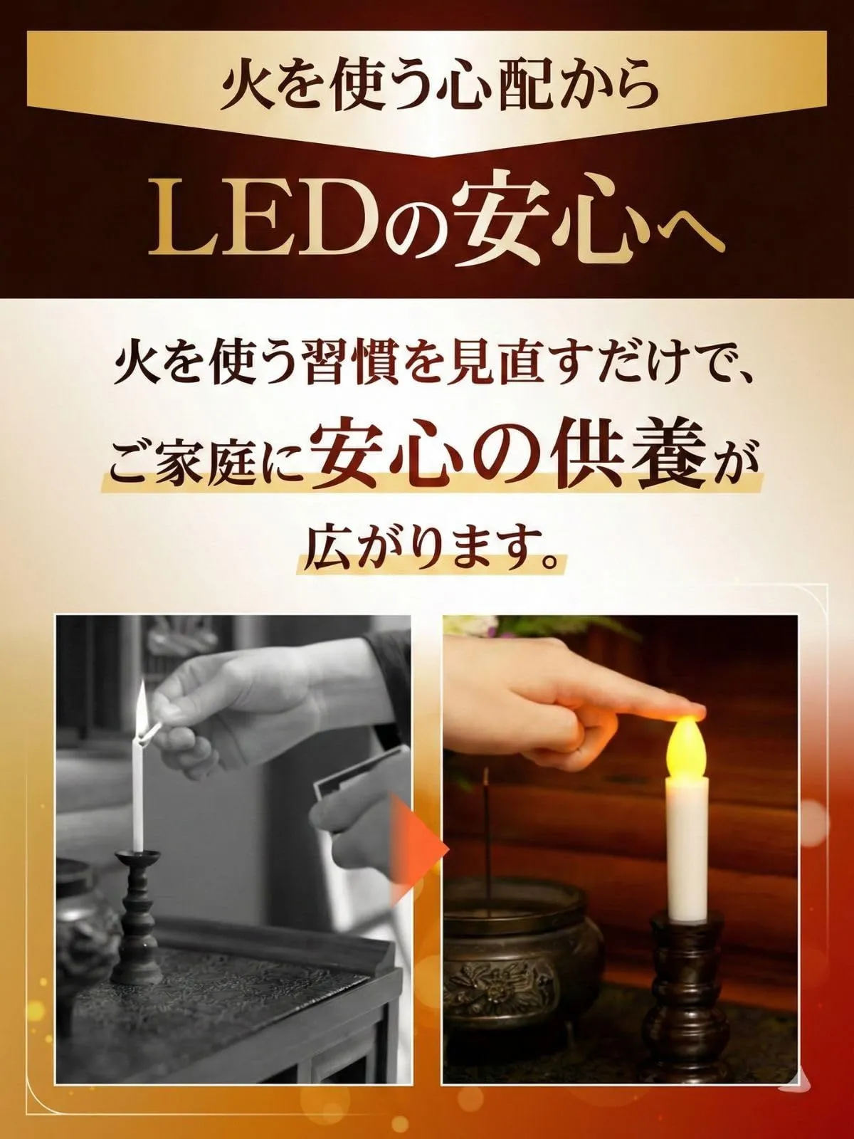 【本物のような ゆらぎ 】実際のロウソクを再現した自然な揺らぎが、お仏壇を優しく照らします。 ?