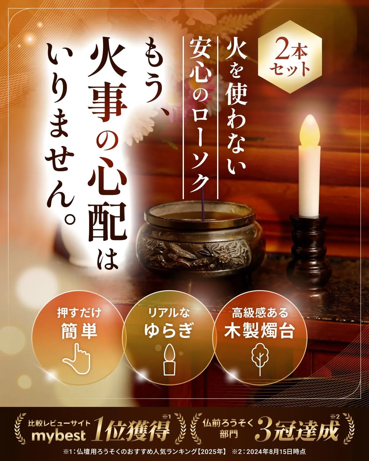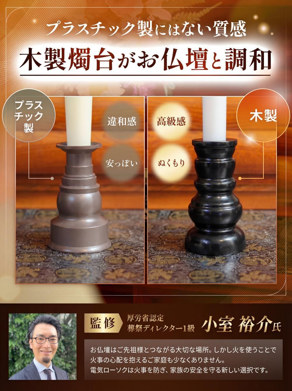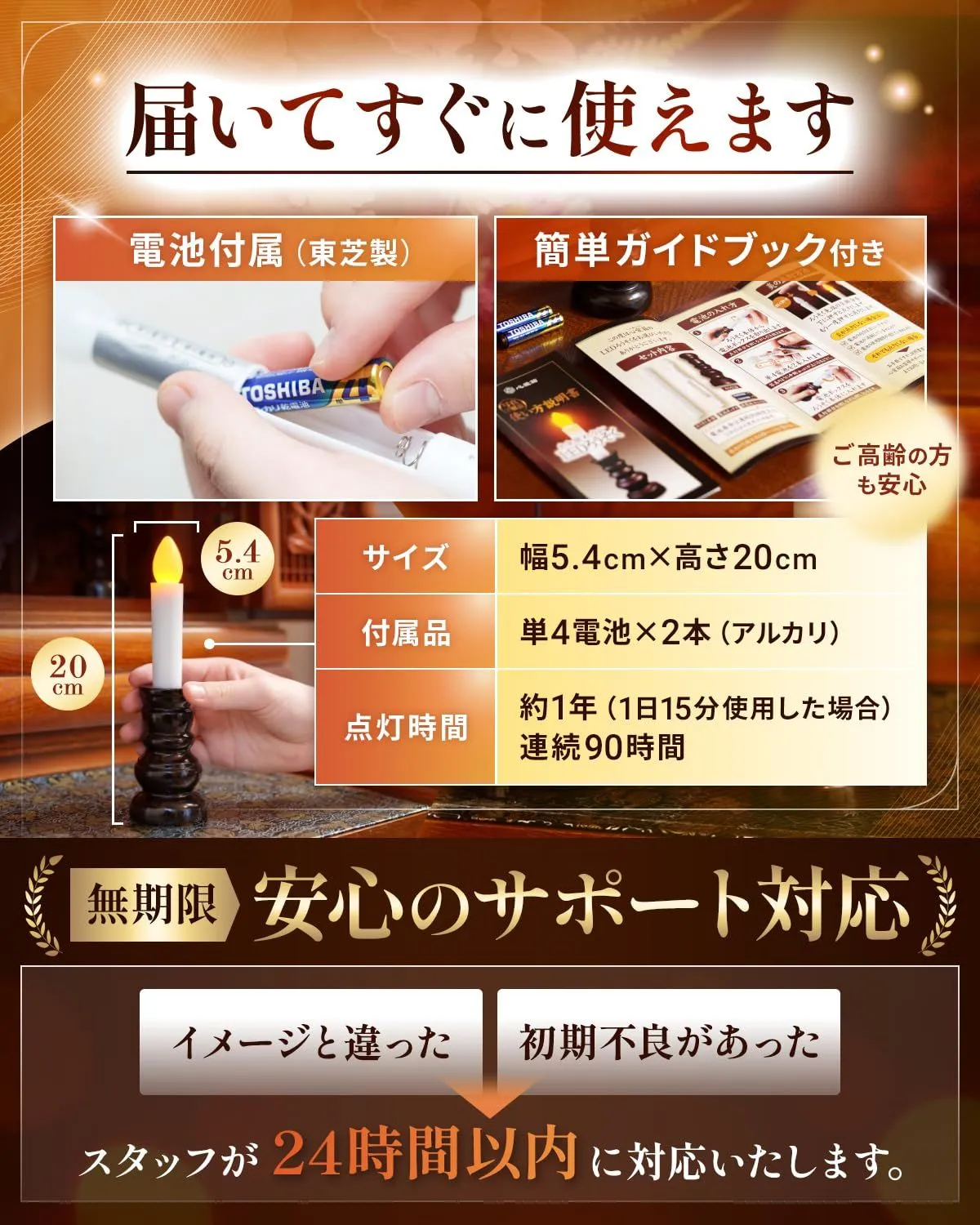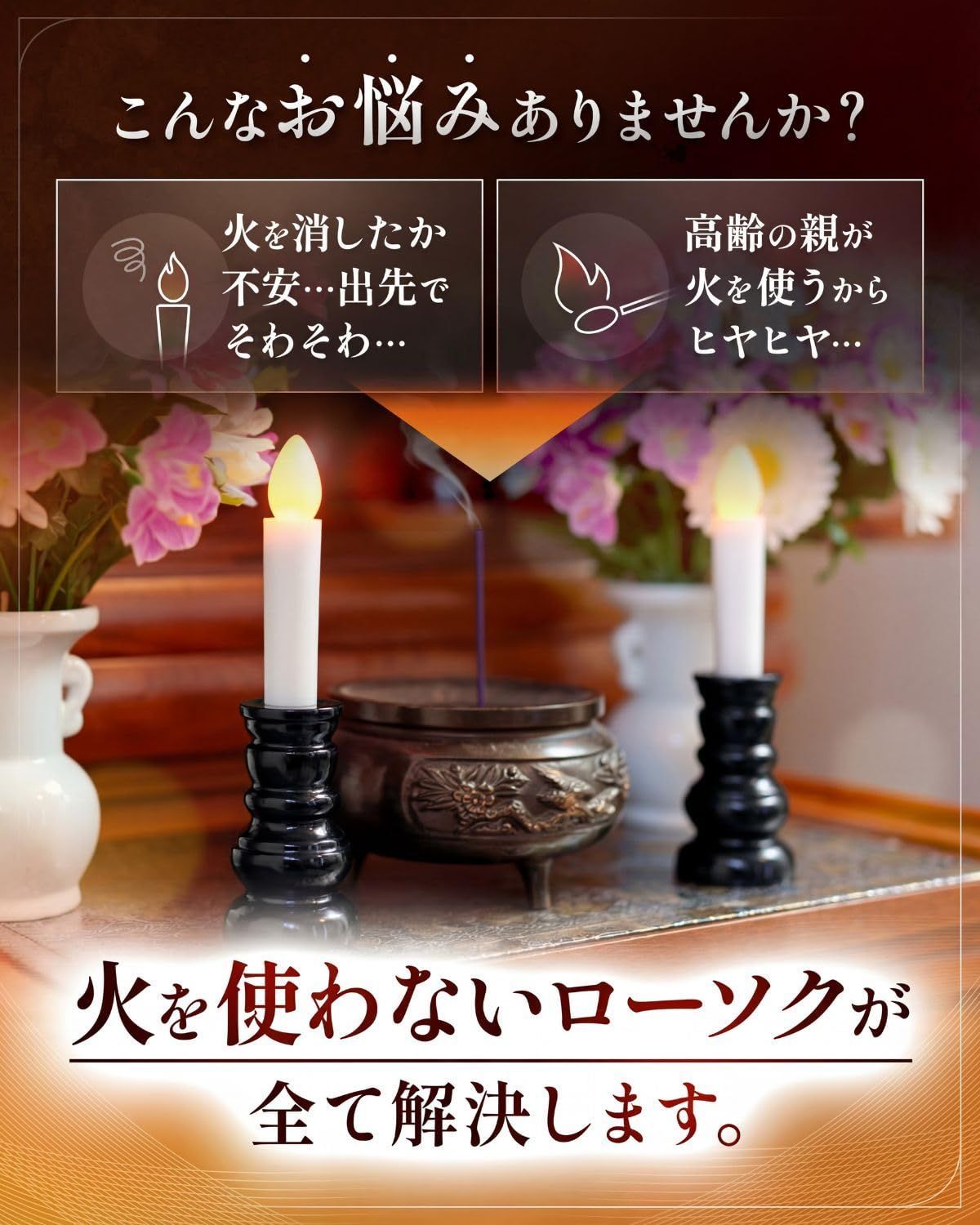 【厚労省認定 葬祭プロ監修】 LED 電池式 仏壇用 ゆらぎ 電気ローソク 木製燭台 火を使わない [2本セット]