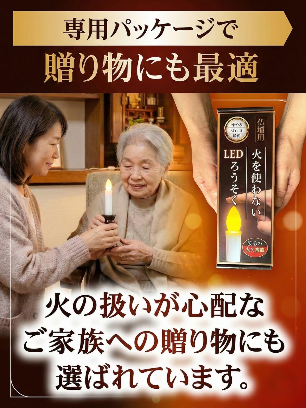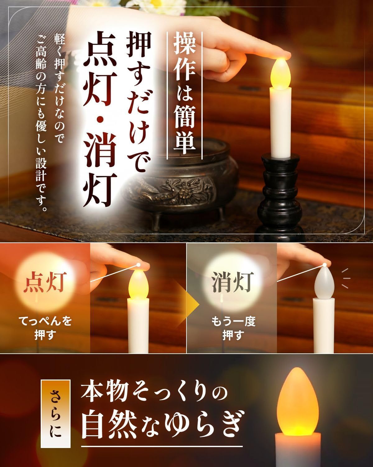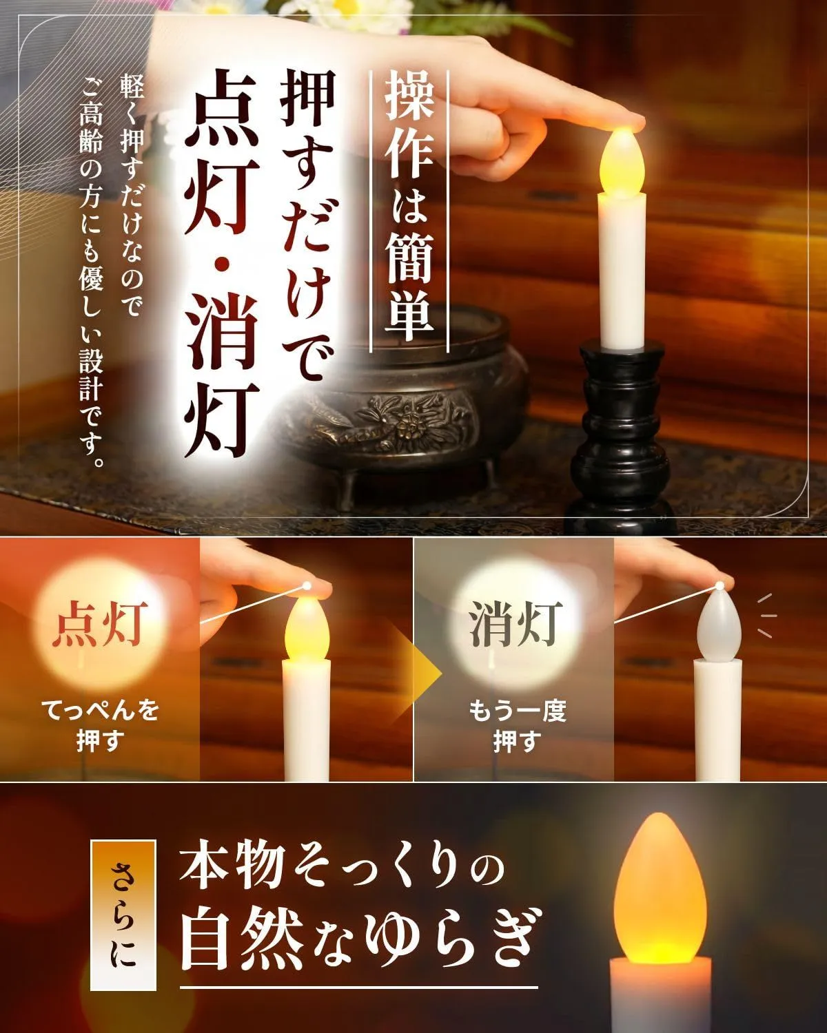 【火を使わない 電気ろうそく 】 軽く押すだけの簡単操作。 LED の炎だから、倒れても火事の心配いらず。 ?