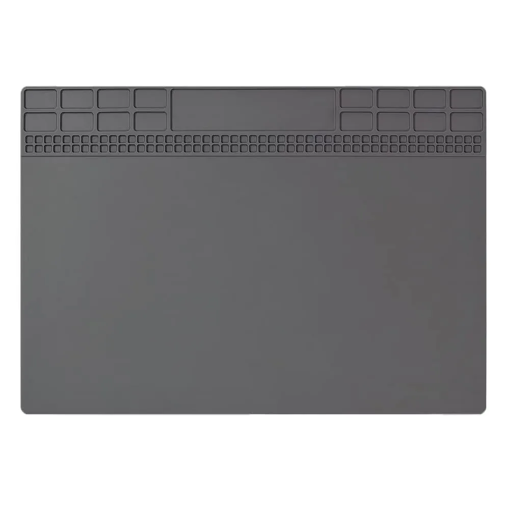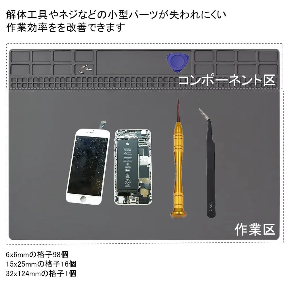 【効率性の向上】両面滑り止めの設計があります。作業の時に勝手に移動することは発生しないです。解体工具やネジなどの小型パーツが失われにくいように、作業マットの上部には6x6mmの格子98個、15x25mmの格子16個、32x124mmの格子1個を設置しています。小さな部品の仕分けを容易にし、効率を向上させました。