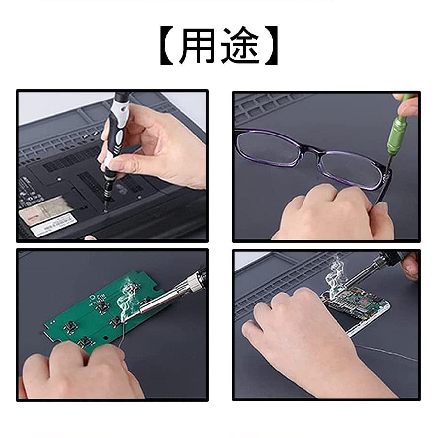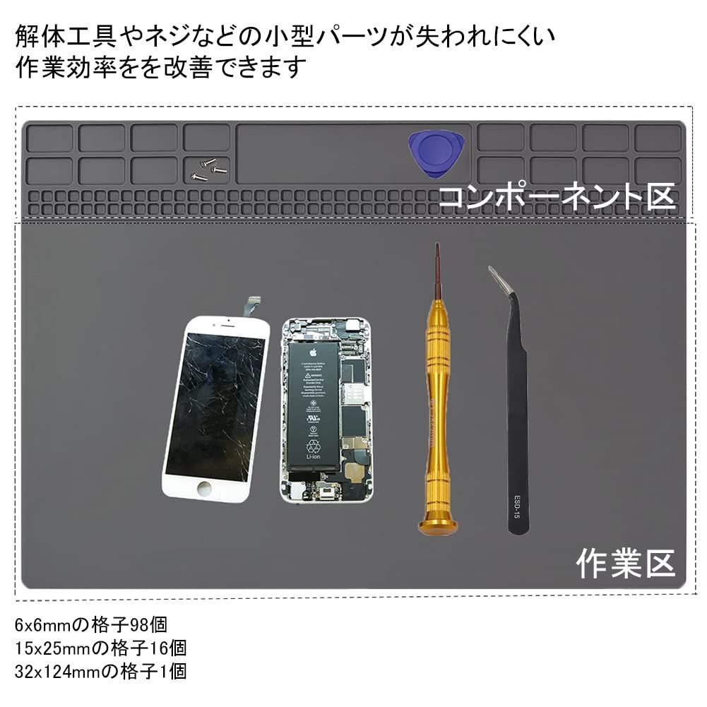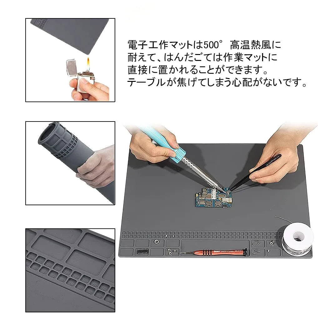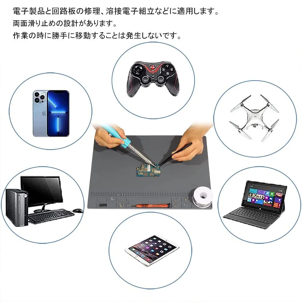 【多機能】当社のはんだ作業マットは電子製品および回路板の修理、溶接電子組立などに適用します。例えばスマートフォン、ノートパソコン、コンピューター、スポーツウォッチ、カメラ、知能のおもちゃ、メガネなどに。電子工作マットは500°高温熱風に耐えて、はんだごては作業マットに直接に置かれることができます。テーブルが焦げてしまう心配がないです。