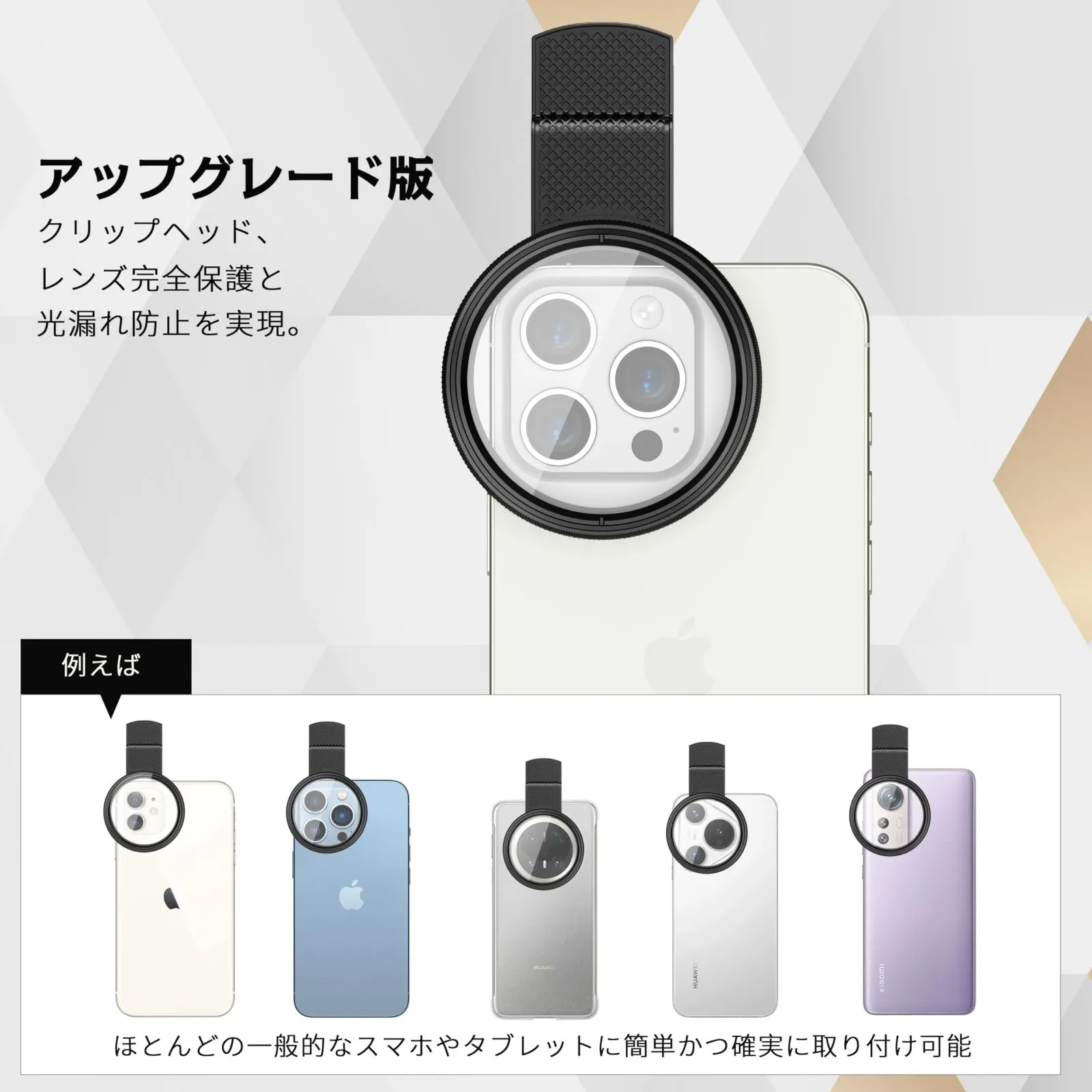 【スマホ用 0.5 秒着脱 防油防水】 特殊円弧エッジ設計で光漏れ完全シャットアウト!クイッククリップ式で挟むだけ、わずか 0.5 秒で装着・取り外し。防振構造 + 耐水耐油防塵、川・海・山のアウトドア撮影に最適、どんな環境でも安心使用可。