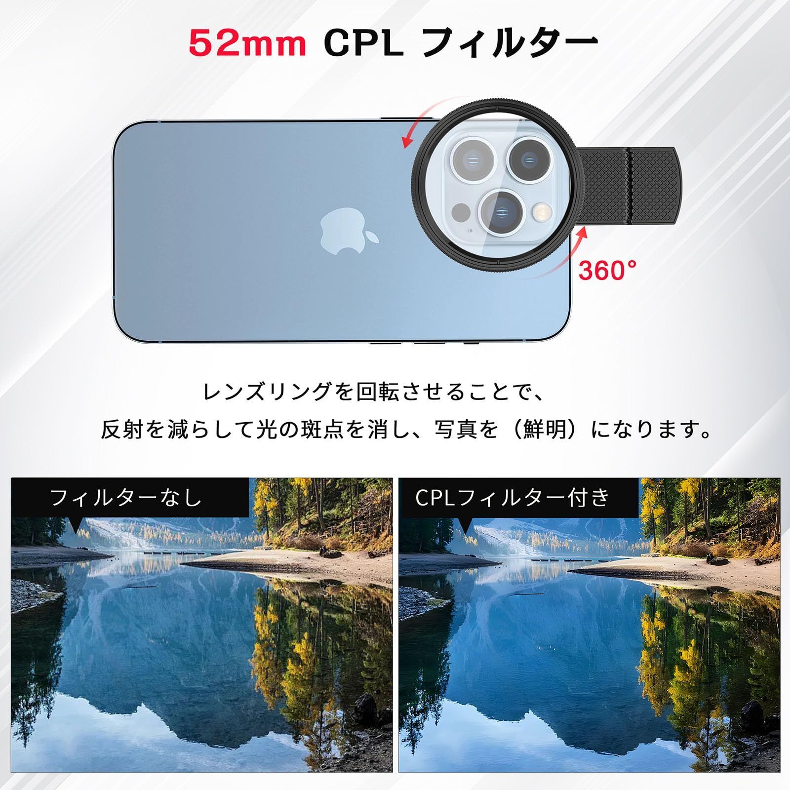 スマホ フィルター 偏光(CPL/c-pl) 52mm 反射調整 超薄枠 着脱簡単 iPhone Samsung Huawei対応 クリスマスギフト/プレゼントに最適