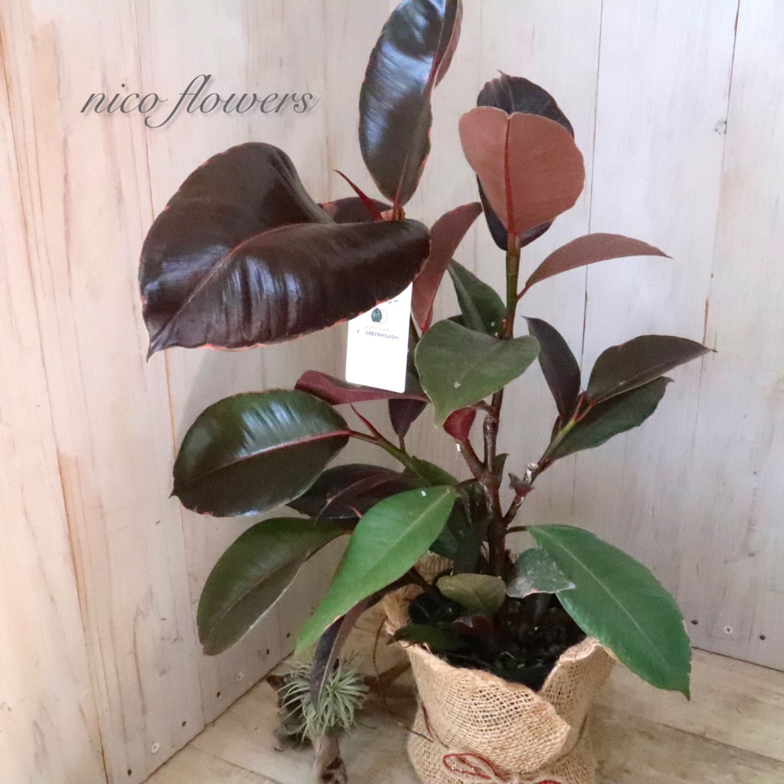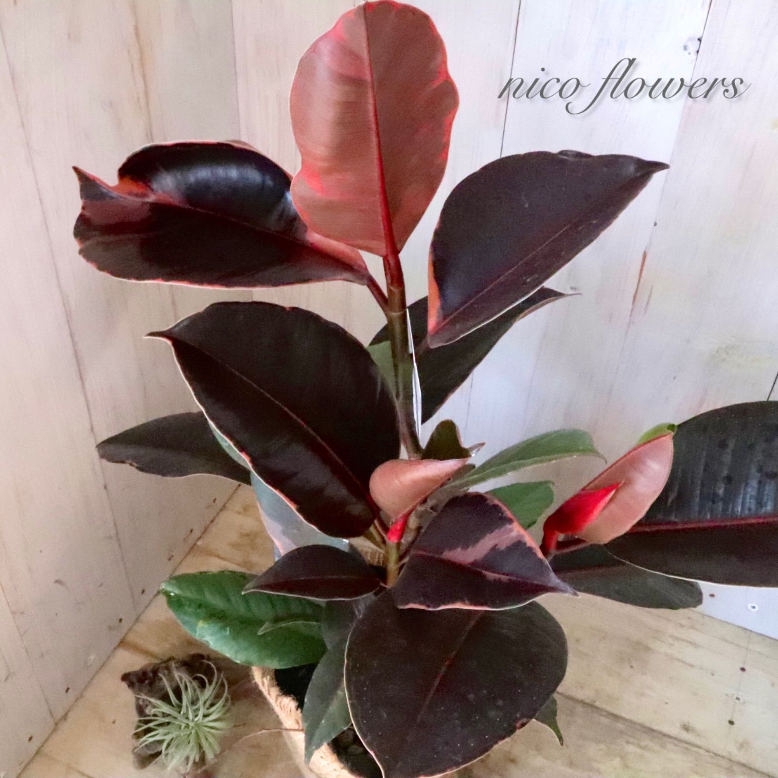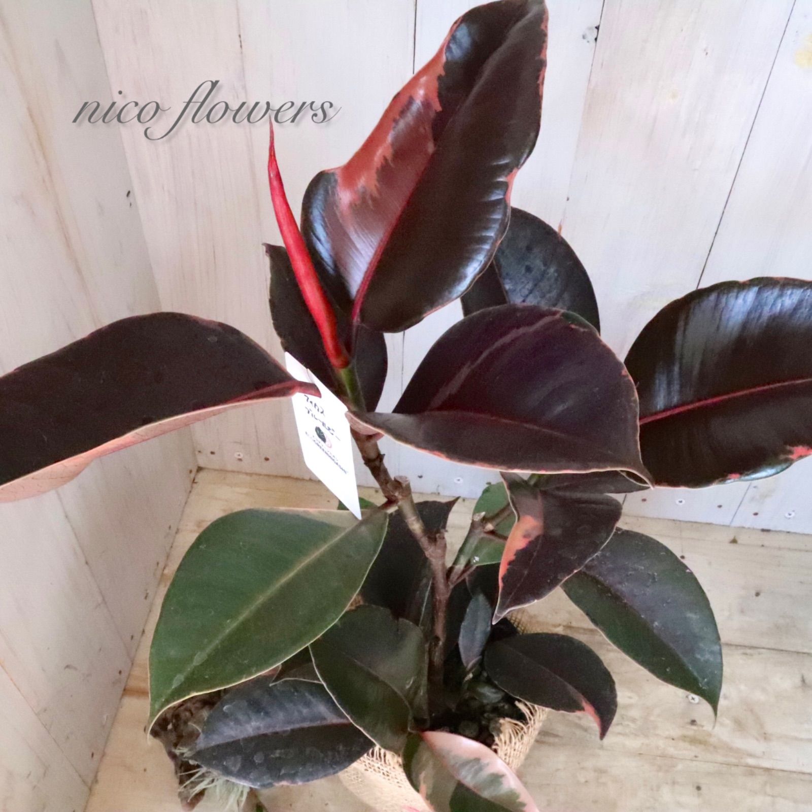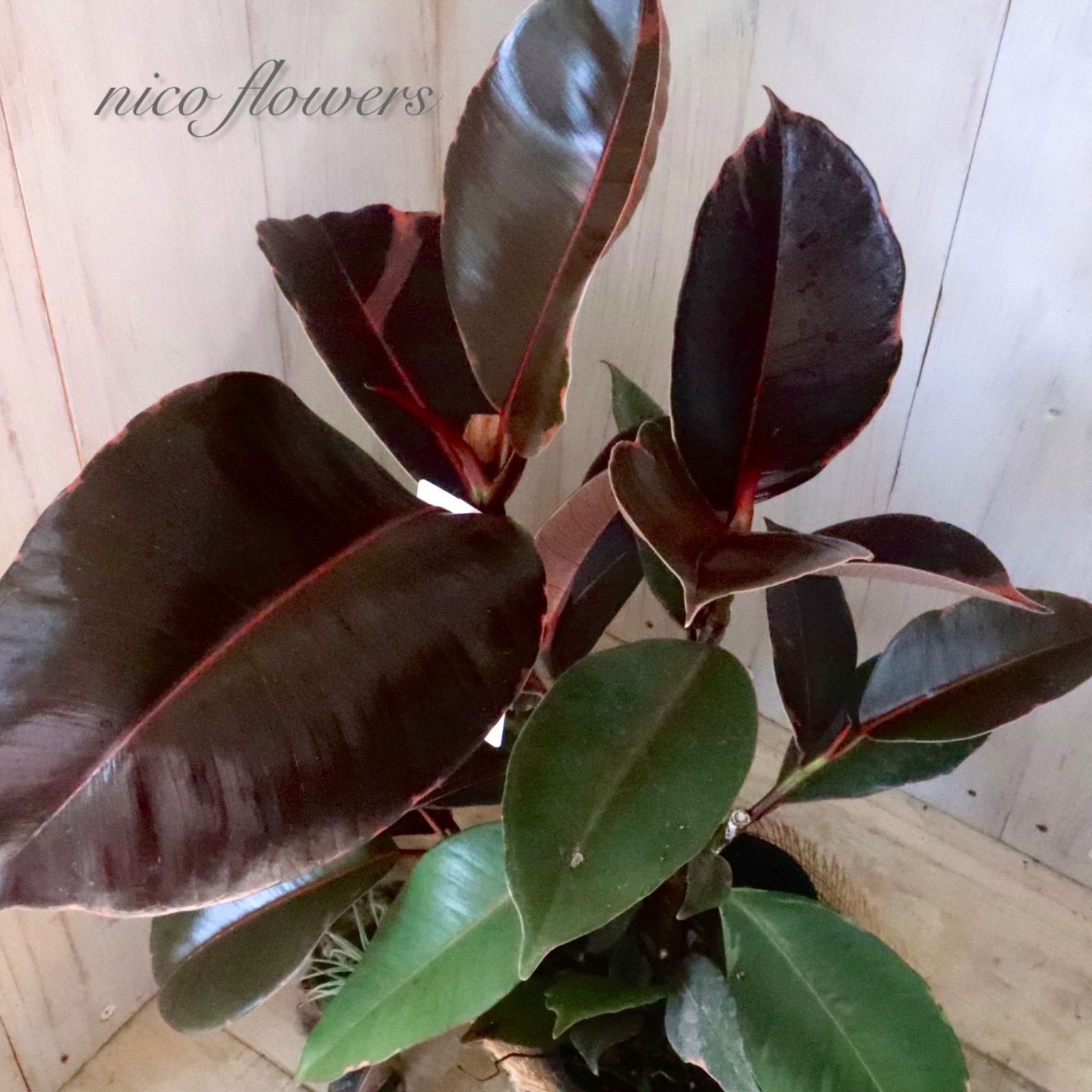 ◆◇ フィカス エラスティカ『ブルールビー』です。 「ブルー」の名のように、成熟した葉は光の加減で青みがかって見える、黒に近いシックな葉色が魅力です^^ 最大の特徴は、新芽が「ルビー」のように鮮やかな赤色に染まります。 この美しい新芽と、ダークな葉色とのコントラストが楽しめます♪ 生命力が強く、丈夫で育てやすいため、観葉植物を初めて育てる方にもおすすめです。 ※樹形・斑入り方には個体差がございます。 ※麻巻きは付属しません。 ☆置き場所☆ 明るい日陰のような場所を好みます。 室内であればレースのカーテン越しに日光が入ってくる窓辺や、午前中のみ直射日光が入ってくる場所がおすすめです。 屋外で育てる場合は急な直射日光に当てると葉焼けをおこすので、徐々に日光に慣らして直射日光で管理するか30~50%程度遮光をした場所で育てると良いでしょう。 風通しの良い場所で。 ☆水やり☆ 鉢土の表面が乾いたら、たっぷりと水を与えます。 冬は水やりを控えめにします。 霧吹きで葉水を与えると元気に育てる事ができます。 ☆全体の大きさ☆ 4寸ポット