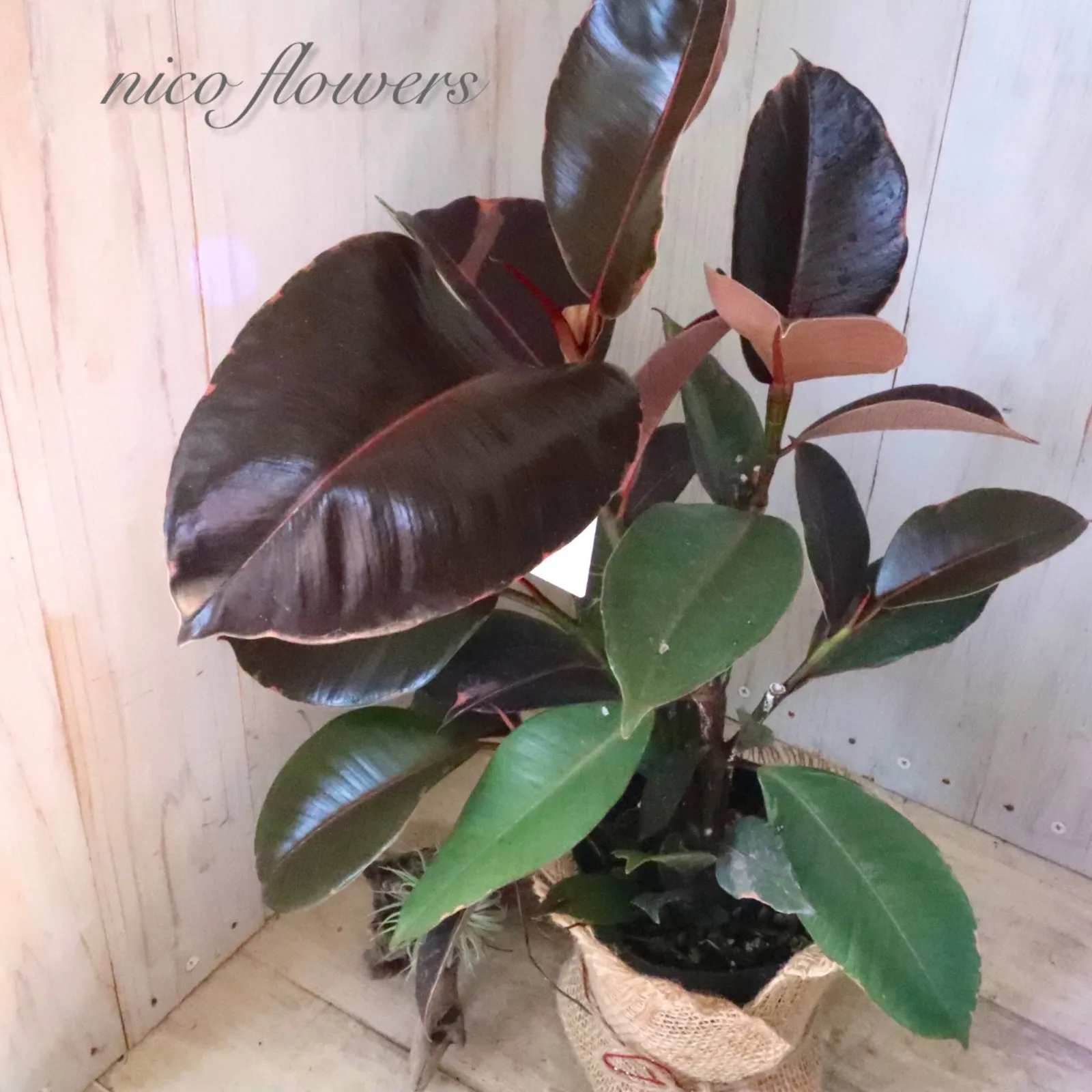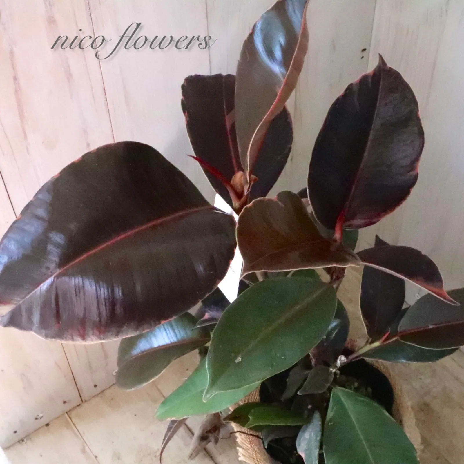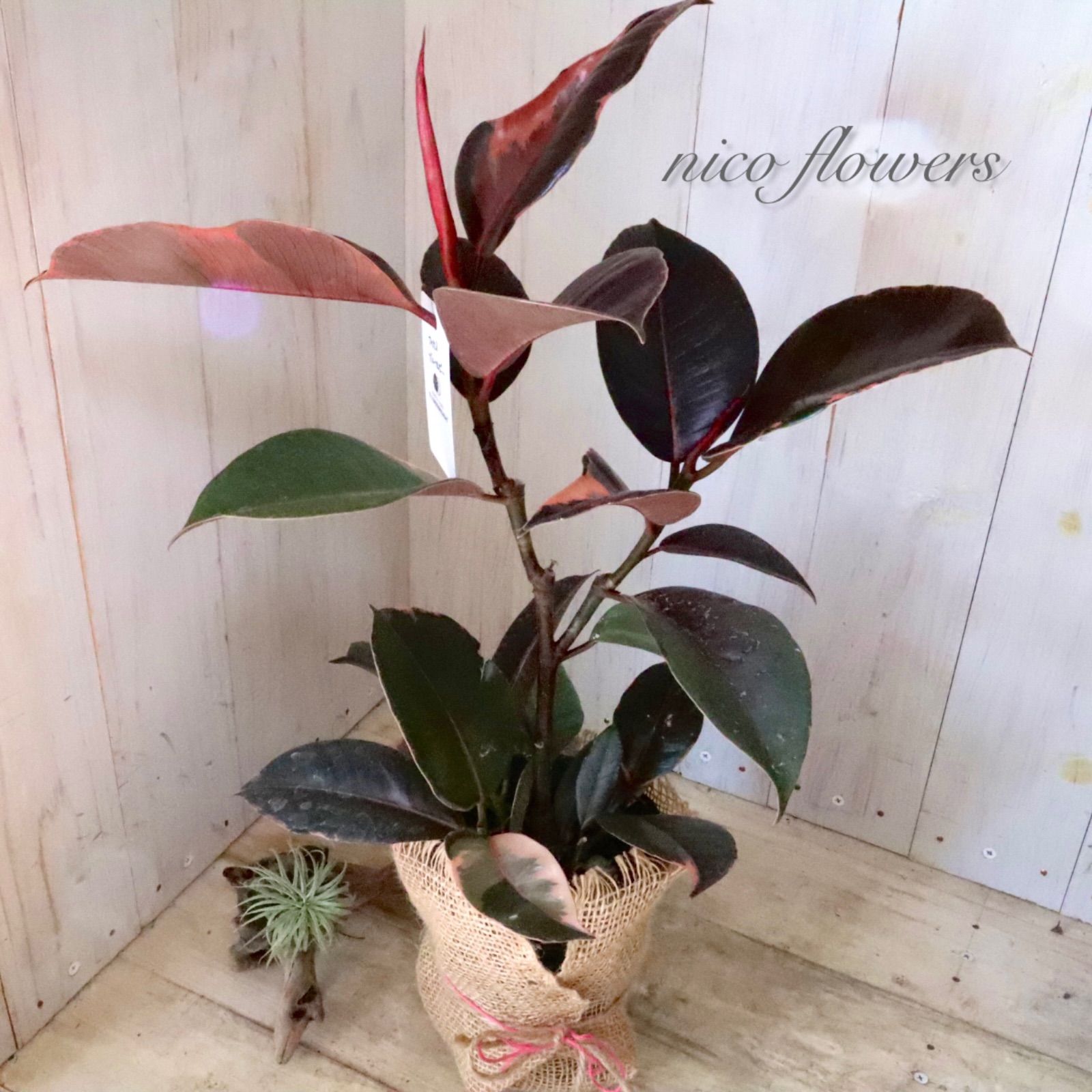 ◆◇ フィカス エラスティカ『ブルールビー』です。 「ブルー」の名のように、成熟した葉は光の加減で青みがかって見える、黒に近いシックな葉色が魅力です^^ 最大の特徴は、新芽が「ルビー」のように鮮やかな赤色に染まります。 この美しい新芽と、ダークな葉色とのコントラストが楽しめます♪ 生命力が強く、丈夫で育てやすいため、観葉植物を初めて育てる方にもおすすめです。 ※樹形・斑入り方には個体差がございます。 ※麻巻きは付属しません。 ☆置き場所☆ 明るい日陰のような場所を好みます。 室内であればレースのカーテン越しに日光が入ってくる窓辺や、午前中のみ直射日光が入ってくる場所がおすすめです。 屋外で育てる場合は急な直射日光に当てると葉焼けをおこすので、徐々に日光に慣らして直射日光で管理するか30~50%程度遮光をした場所で育てると良いでしょう。 風通しの良い場所で。 ☆水やり☆ 鉢土の表面が乾いたら、たっぷりと水を与えます。 冬は水やりを控えめにします。 霧吹きで葉水を与えると元気に育てる事ができます。 ☆全体の大きさ☆ 4寸ポット