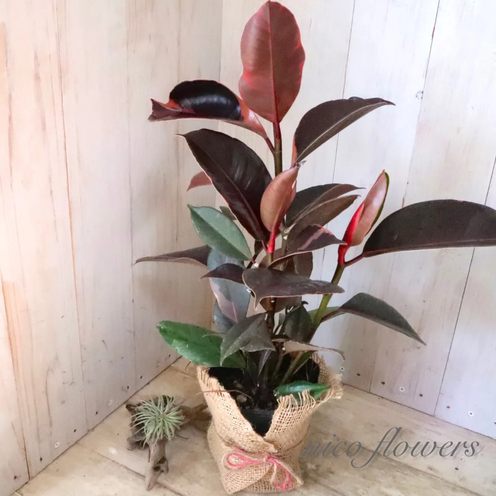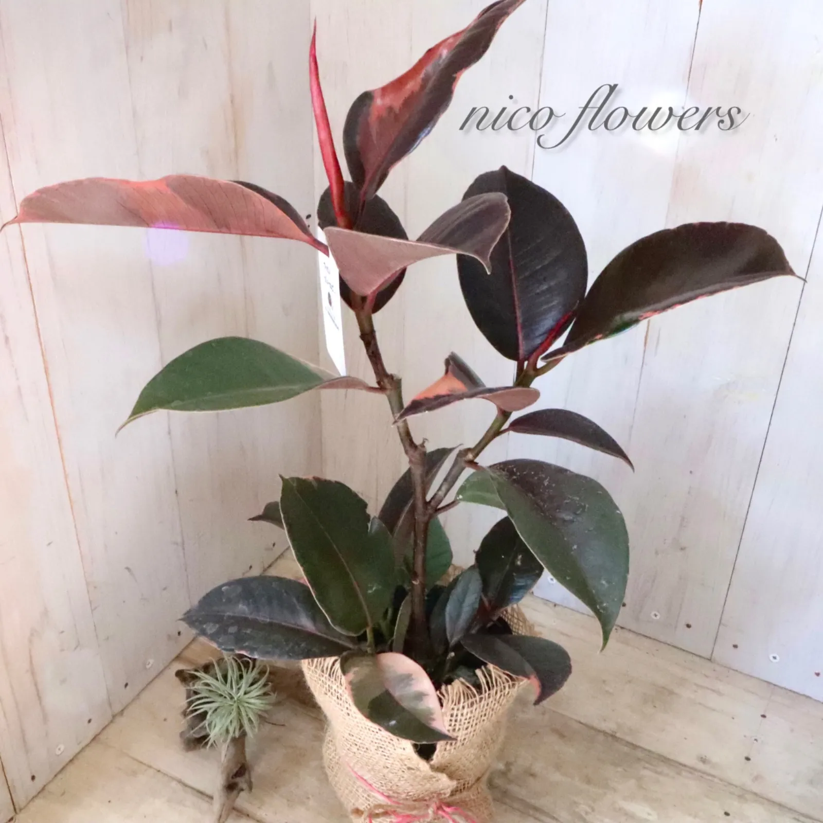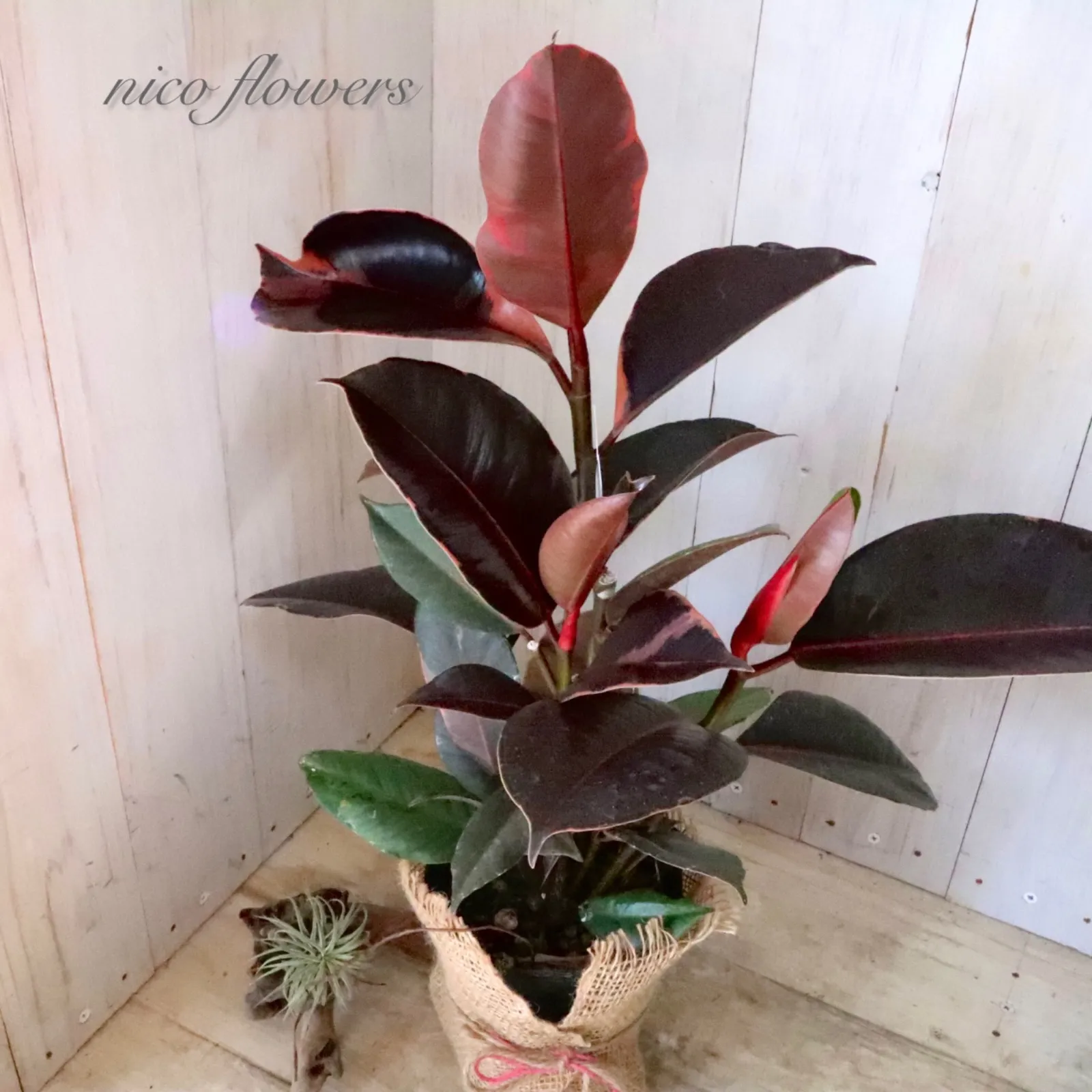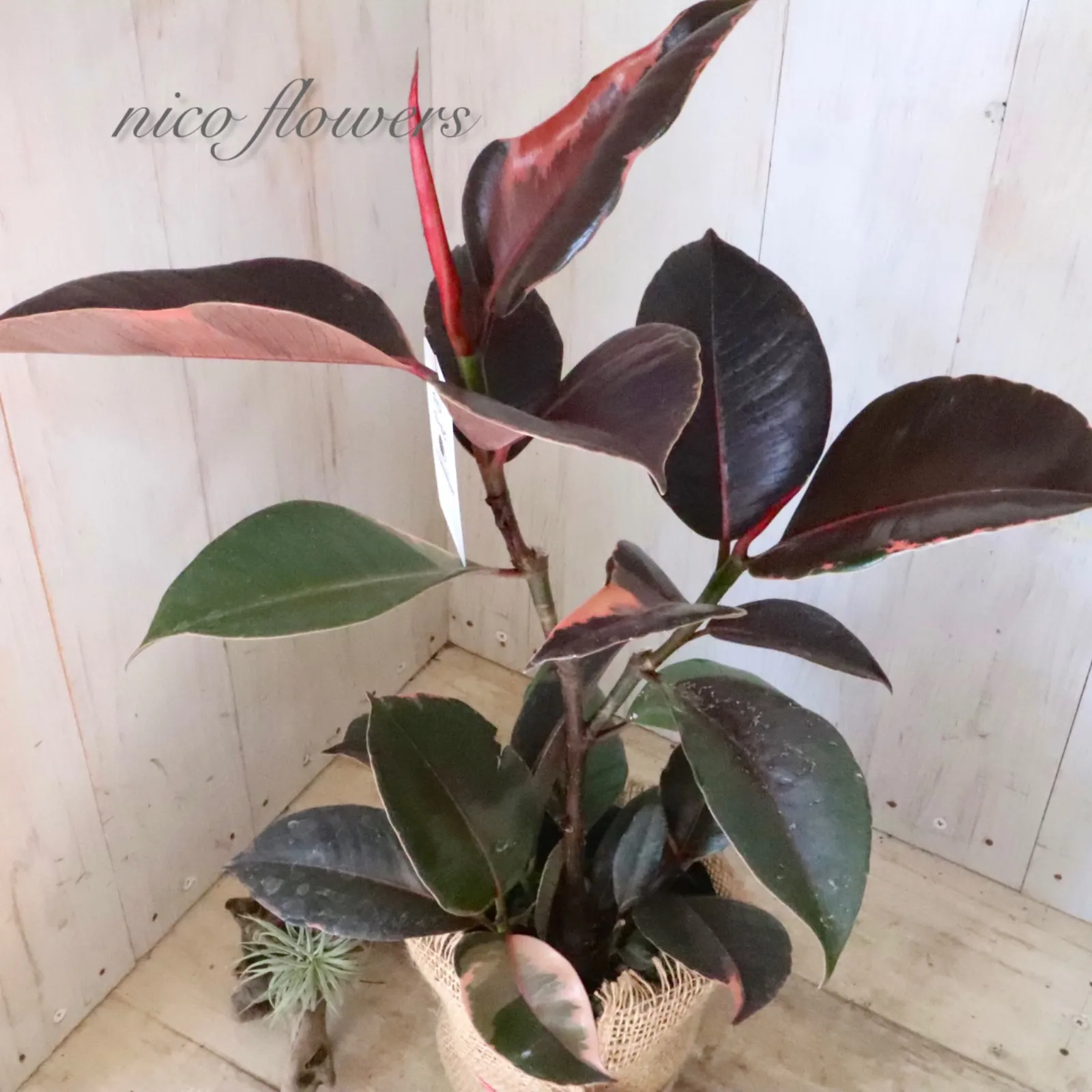 ◆◇ フィカス エラスティカ『ブルールビー』です。 「ブルー」の名のように、成熟した葉は光の加減で青みがかって見える、黒に近いシックな葉色が魅力です^^ 最大の特徴は、新芽が「ルビー」のように鮮やかな赤色に染まります。 この美しい新芽と、ダークな葉色とのコントラストが楽しめます♪ 生命力が強く、丈夫で育てやすいため、観葉植物を初めて育てる方にもおすすめです。 ※樹形・斑入り方には個体差がございます。 ※麻巻きは付属しません。 ☆置き場所☆ 明るい日陰のような場所を好みます。 室内であればレースのカーテン越しに日光が入ってくる窓辺や、午前中のみ直射日光が入ってくる場所がおすすめです。 屋外で育てる場合は急な直射日光に当てると葉焼けをおこすので、徐々に日光に慣らして直射日光で管理するか30~50%程度遮光をした場所で育てると良いでしょう。 風通しの良い場所で。 ☆水やり☆ 鉢土の表面が乾いたら、たっぷりと水を与えます。 冬は水やりを控えめにします。 霧吹きで葉水を与えると元気に育てる事ができます。 ☆全体の大きさ☆ 4寸ポット