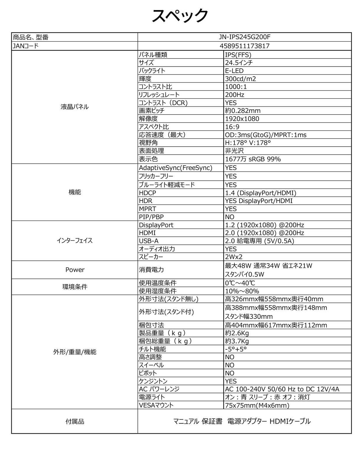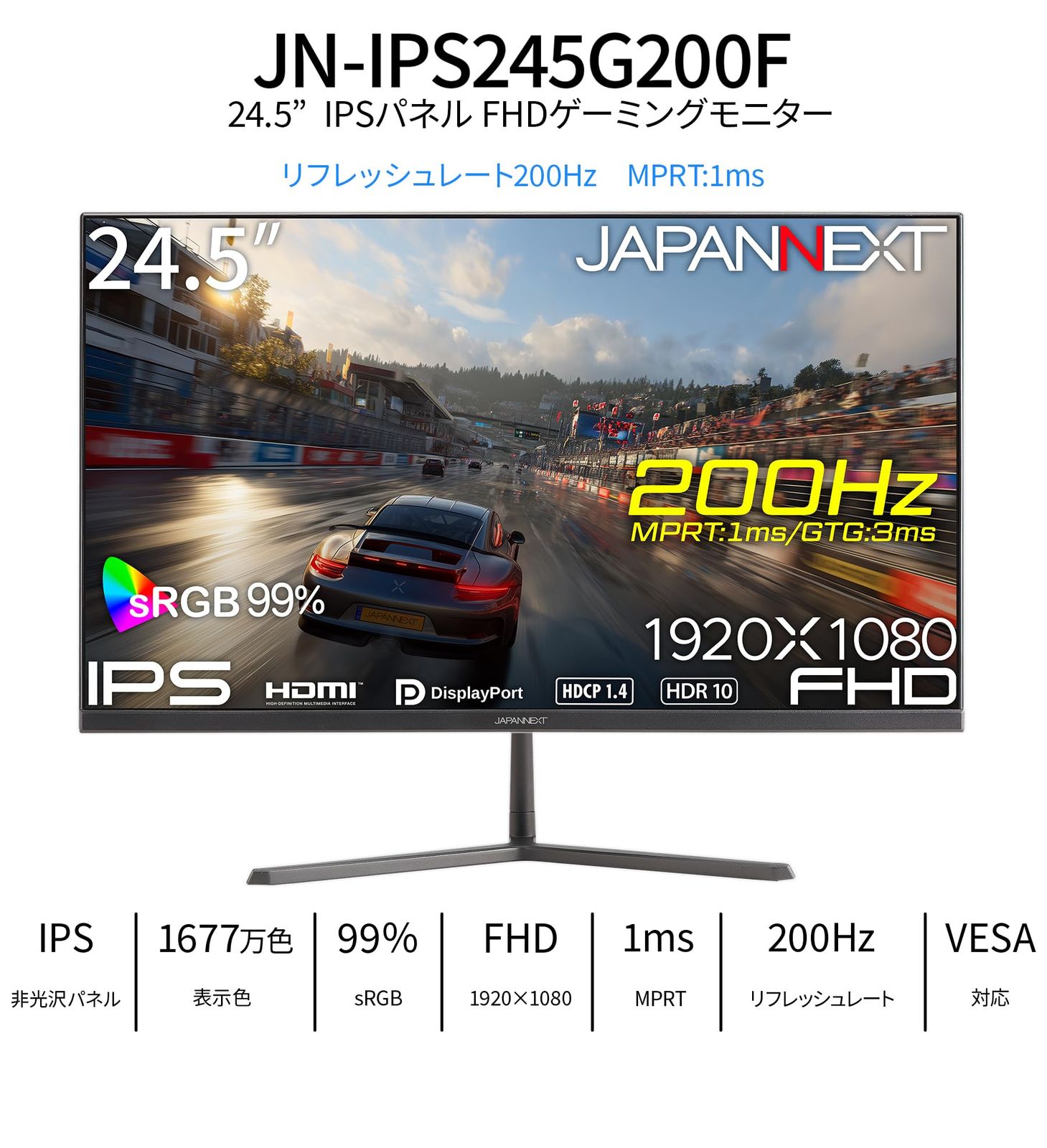 新品 JAPANNEXT 24.5インチ IPSパネル搭載 200Hz/1ms(MPRT)対応 フルHD(1920x1080)解像度 ゲーミングモニター JN-IPS245G200F HDMI DP sRGB:99% HDR PS5 フルHD:120Hz接続