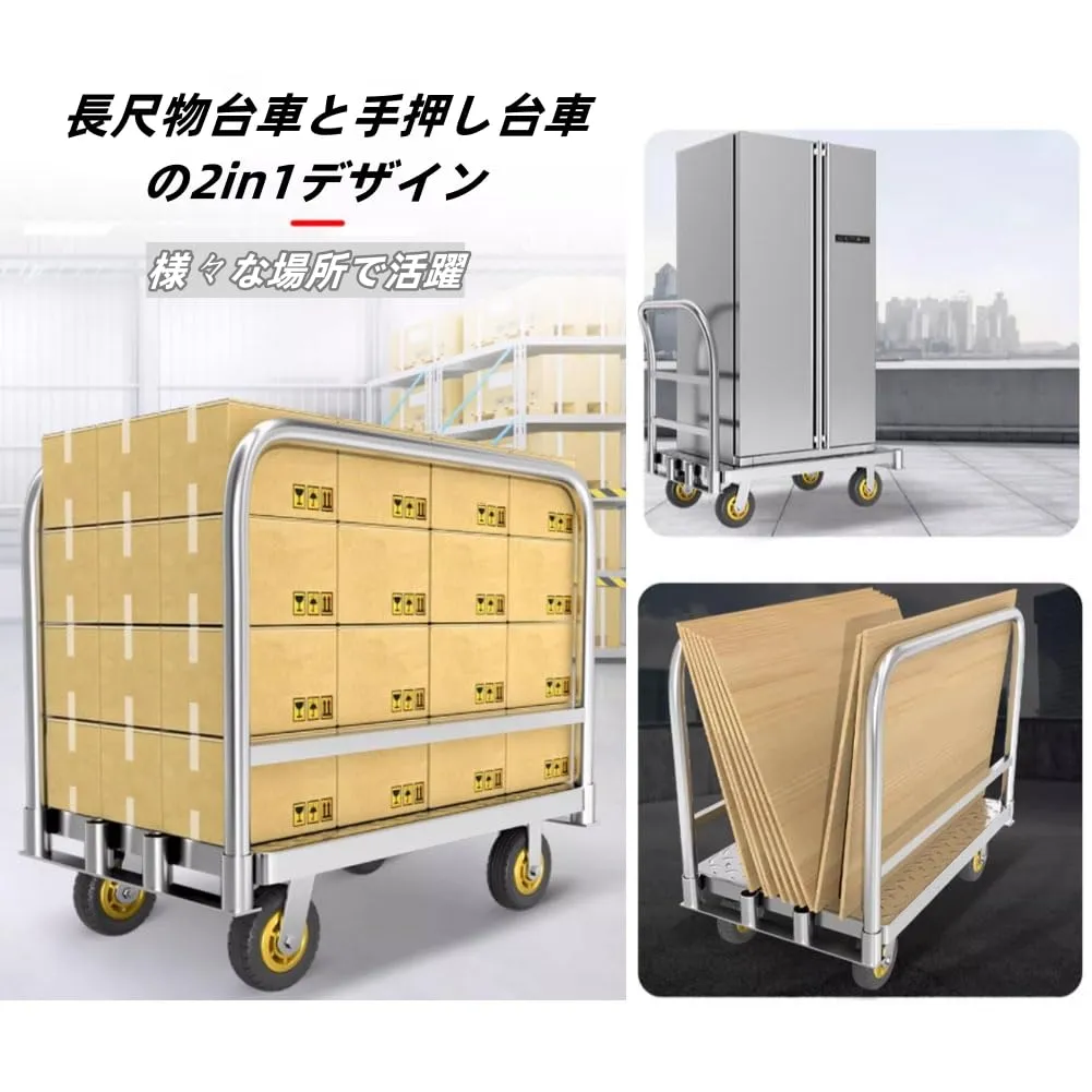[2in1多機能]長尺物台車と手押し台車の2in1デザインで、使い方に応じて自由に対応ができ、大型のアイテムや建材などを安全に移動できます。