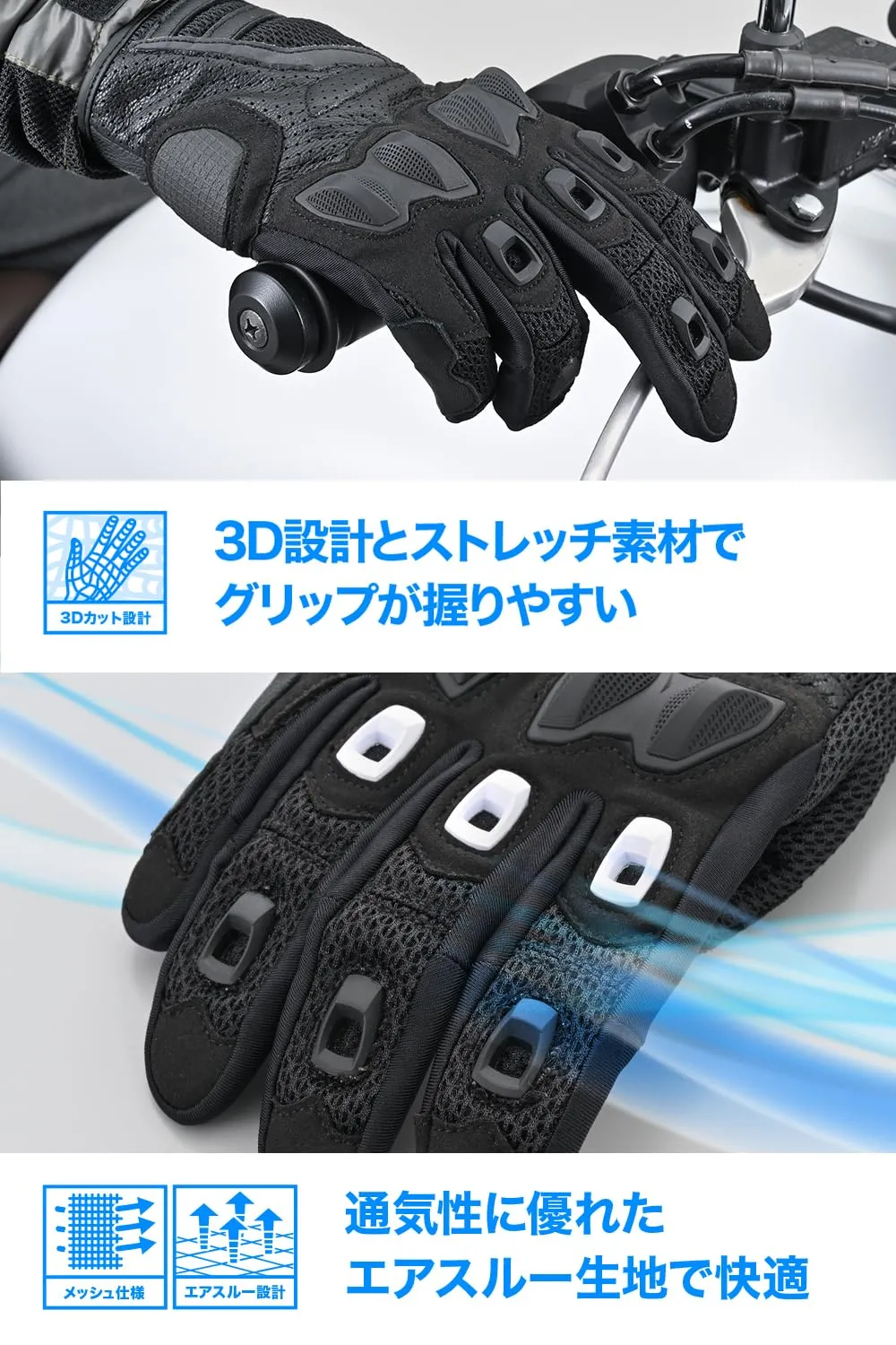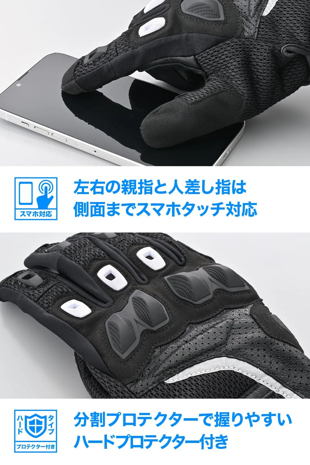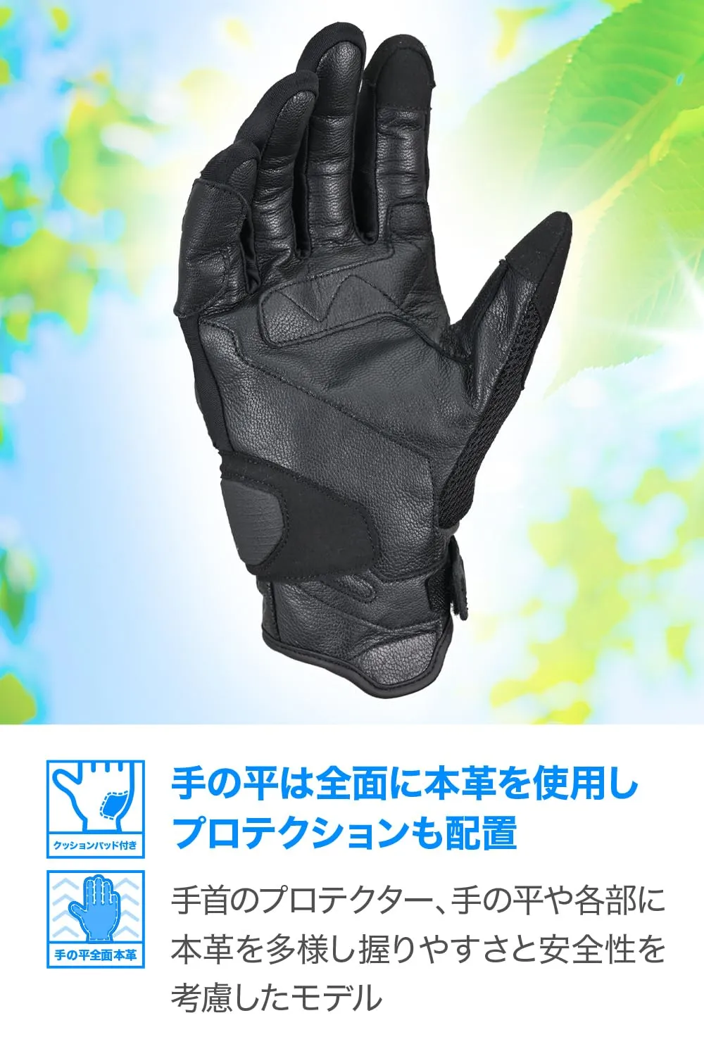 通気性の高いメッシュ素材に指部分へ通気孔を装備。真夏のライディンングを快適に