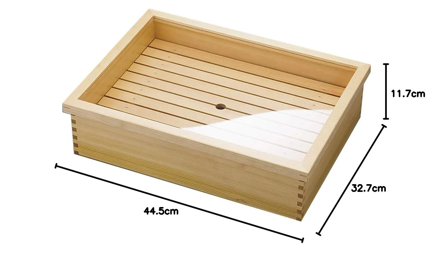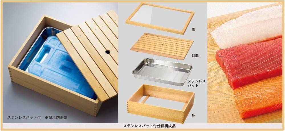 ヤマコー 日本製 ネタ箱 かぶせ蓋 目皿・ステンレスバット付 (大) 44.5×32.7×11.7cm 業務用 木製 白木 10344