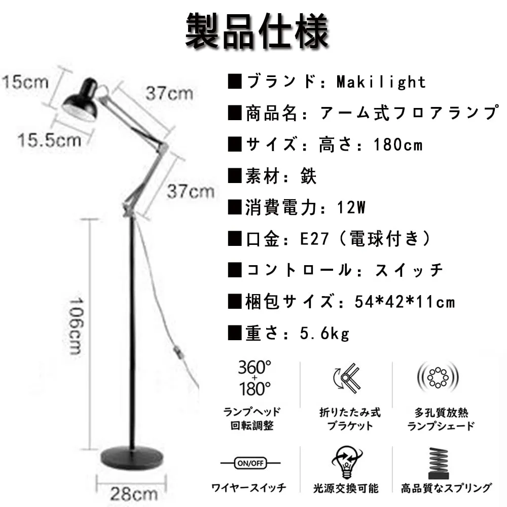 新品 Makilight LEDフロアランプ 12W アーム式フロアライト 3階段調光モード スタンドライト 無段階調光 LED電球付き フロアスタンド 間接照明 照明器具 復古スタイル シンプル風 アームライト おしゃれ 口金E27 目に優しい 高輝度 照明
