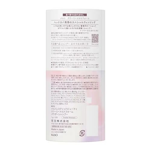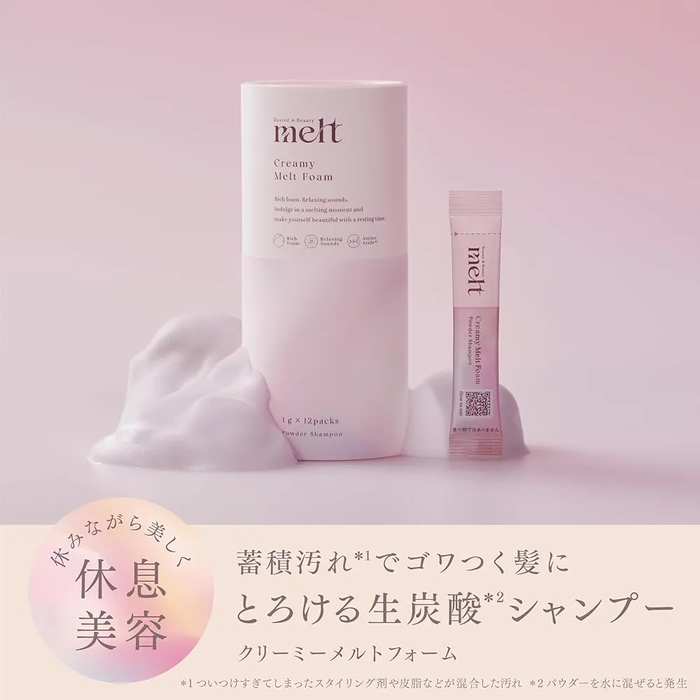 頭皮と髪をよく濡らします。スティック1包(1 g)を開け、充分に濡らした手の上に粉を乗せます。メルトシャンプー(液体)を上に乗せます。(セミロングで2プッシュ程度)混ぜます。とろけるような濃密泡ができます。髪に塗布し、普段通り洗髪します。週に2~3回のご使用をおすすめします。使い方単品で使う場合は、頭皮と髪をよく濡らします。スティック1包(1 g)を開け、充分に濡らした手に出し、水とよく混ぜます。頭皮と髪全体になじませ、洗います。頭皮からよく洗い流します。