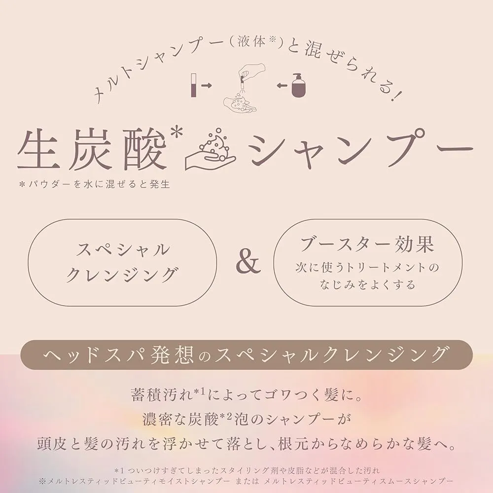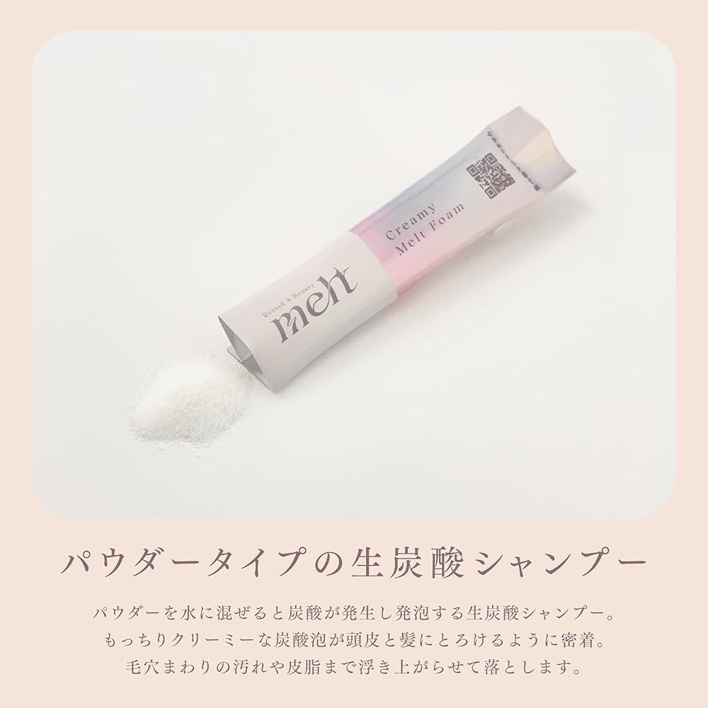 炭酸パウダー(本品)とメルトシャンプー(液体)を混ぜても使える!ヘッドスパ発想!とろシュワ濃密泡の生炭酸シャンプー。パウダーを水に混ぜると炭酸が発生して発泡するシャンプー。もっちりクリーミーな炭酸泡が頭皮と髪にとろけるように密着。髪をときほぐしながらなじませると、毛穴まわりの汚れや皮脂まで浮き上がらせて落とし、清潔な頭皮と毛髪に整えます。次に使うトリートメントのなじみをよくするブースター効果も。