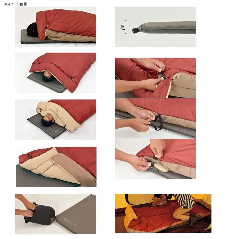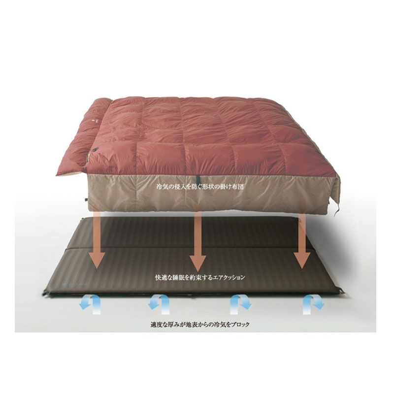 ●地表からの冷気を遮断する厚さ5cmのマットと、隙間の生まれにくい特殊形状の掛け布団により通常の寝袋同様の保温性を実現しました。「キャンプ=寝袋」という既成概念から脱却し、家庭用布団で寝るあの快適さをキャンプでも体感いただけます。