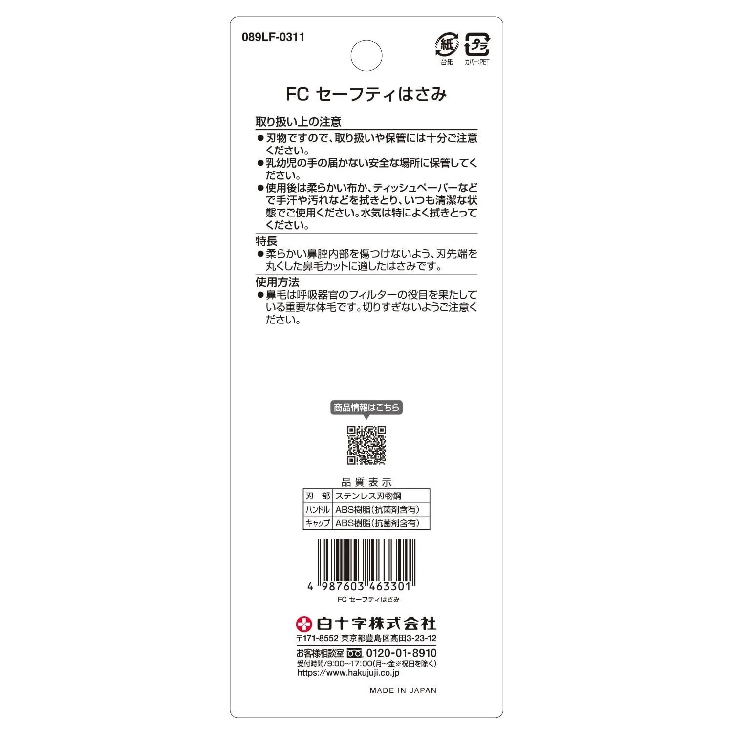 【日本製】 柔らかい鼻腔内部を傷つけないよう、刃先が丸くなっています。 抗菌樹脂(持ち手、キャップ) さびにくいステンレス製 キャップ付きで持ち運びにも便利です。 内容量:1本 色:白