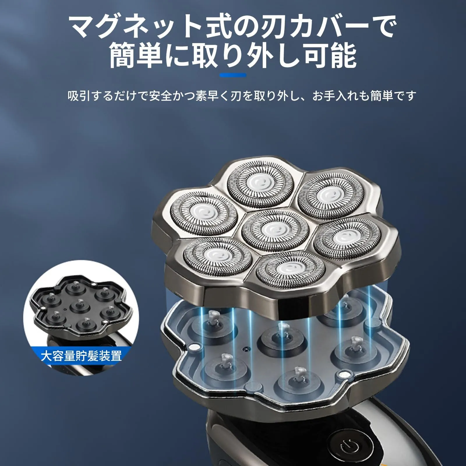 「簡単なお手入れ&超大な髭貯蔵スペース」 マグネット式で簡単に取り外せるため、水ですすぐだけでスキンヘッドシェーバーを清潔に保てます。