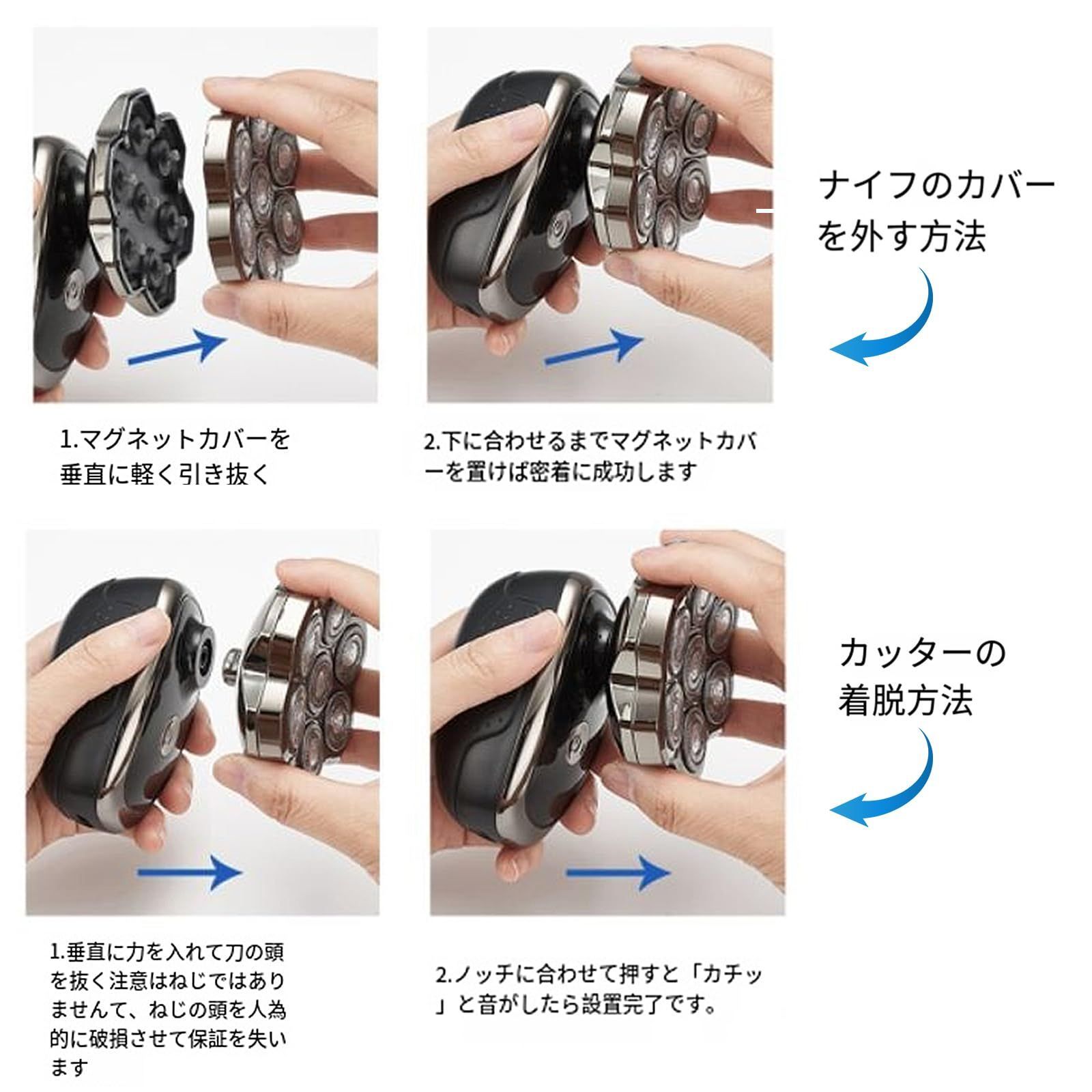 「マグネット式ヘッド&替刃が付き」シェーバーは、革新なマグネット式ヘッドを採用。ヘッドを直接上から垂直に取り外せるため、ヒゲや髪くずの洗い流しが非常に簡単になります。