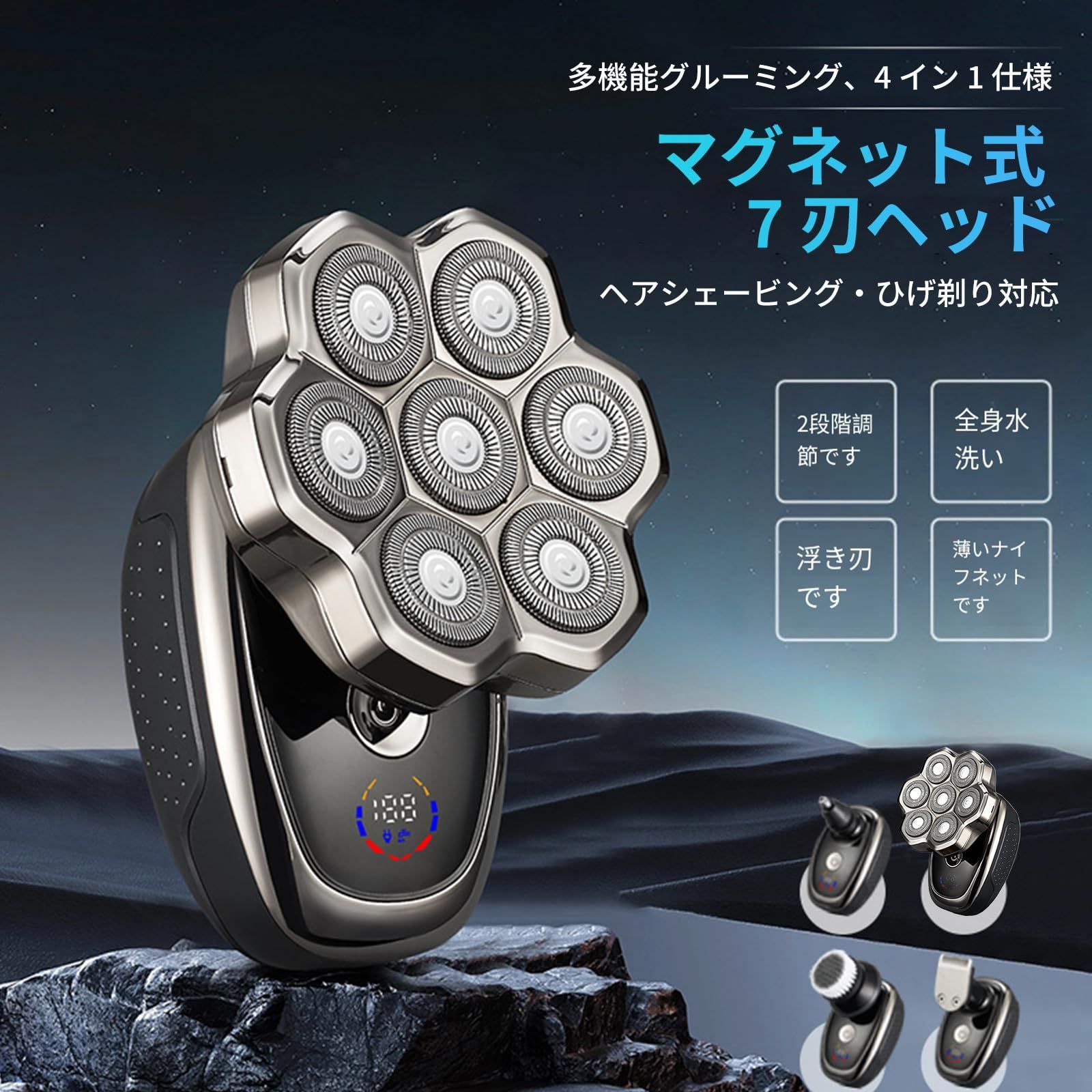 スキンヘッド用シェーバー スキンヘッド メンズ 電動シェーバー 電気シェーバー 男性用 全身防水 4in1 乾湿両用 回転 ひげそり マグネット式 LEDディスプレイ 充電式 父の日 プレゼント ギフト