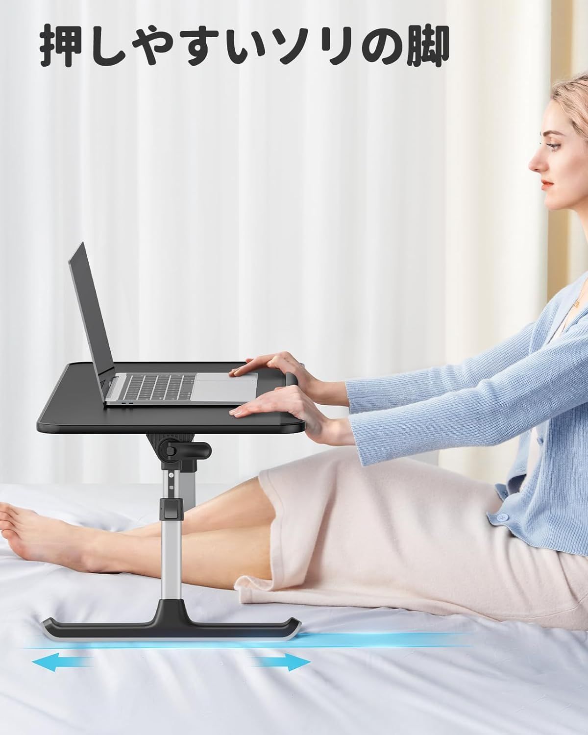 【高さ・角度調整】高さは24~32cmの5段階、角度は0~36度の4段階を調整でき、お好みや使用場面に合わ せて自由にお使い頂けます。天板の下には広々とした空間があるので、ベッドや絨毯の上に使用したい場合は両足 が自由に動け、窮屈感がなくゆったり過ごせます