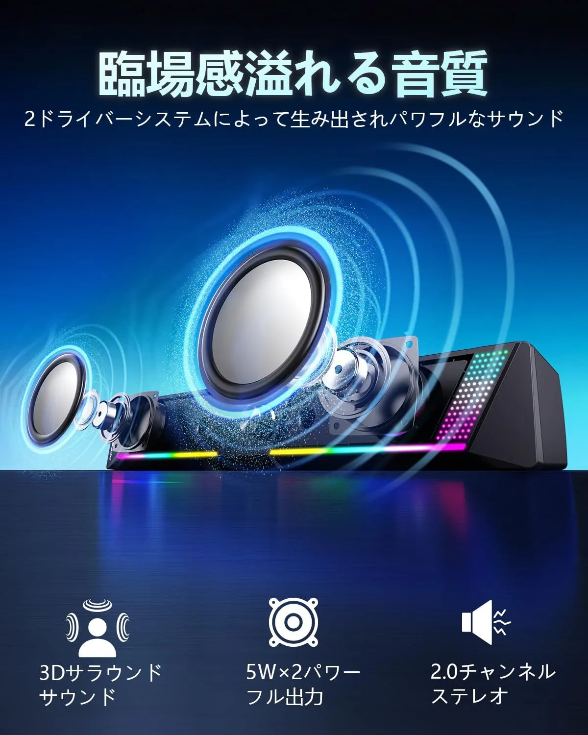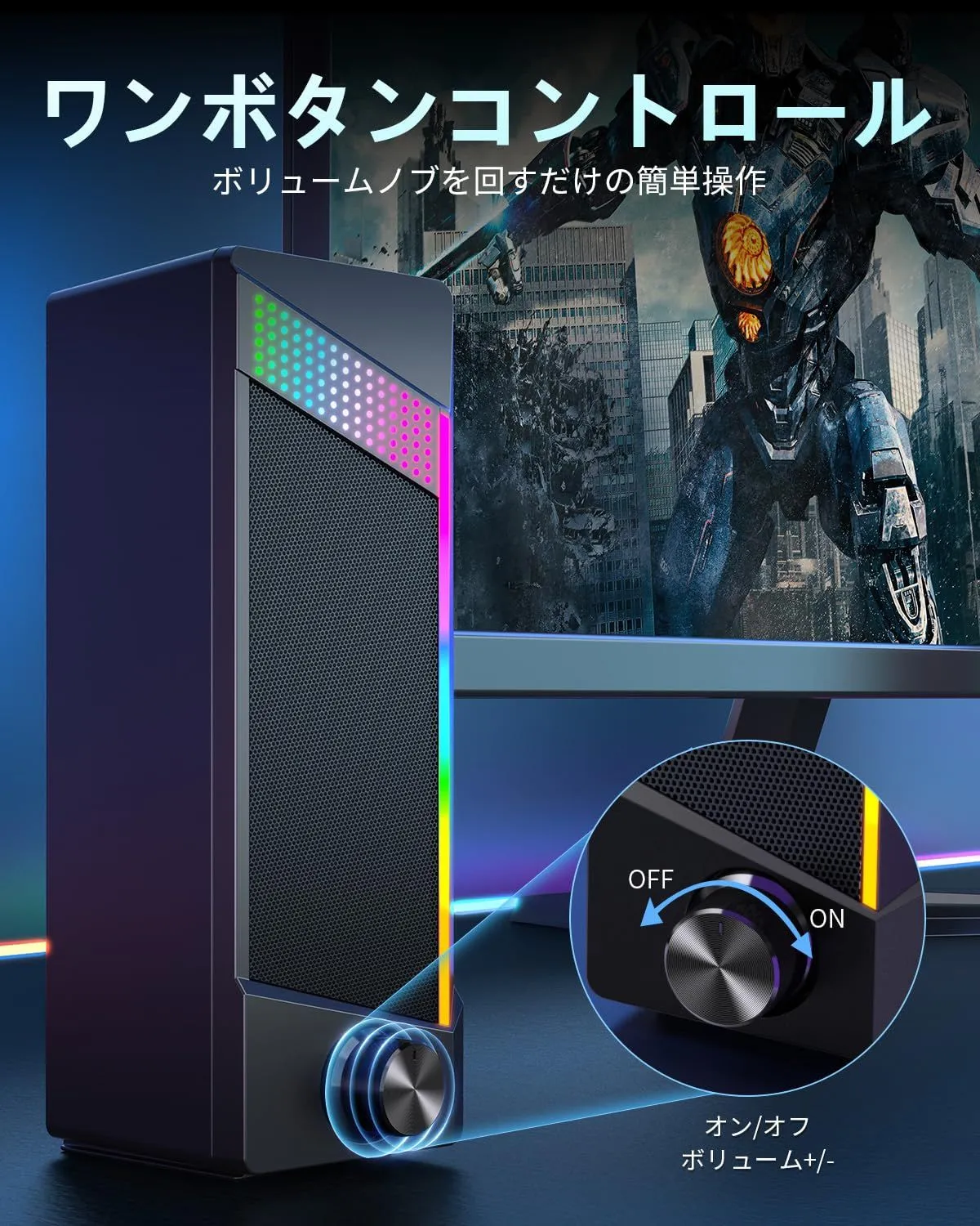 【RGBダイナミック照明効果】素敵なカラフルな呼吸サイクルRGBライトを備えており、ゲームをしたり、映画を見たり、音楽を聴いたりする時に雰囲気を高めます。スピーカー本体はクラシックでミステリアスなブラックトーンを採用し、RGBライトで飾られ、全体の形はとてもクールで、PCゲームに最適です。