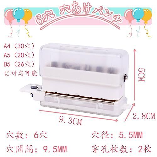 【多機能】ルーズリーフの作り、システム手帳 、バインダーノート、伝票、書類の 整理が楽々です。可愛くて、シンプルでプレゼントとしてもできます。サイズ:9.3*5*2.8cm 重さ:約70g 穿孔枚数:2枚 穴数:6穴、穴径:5.5mm、奥行き:7mm、穴間隔:9.5mm。
