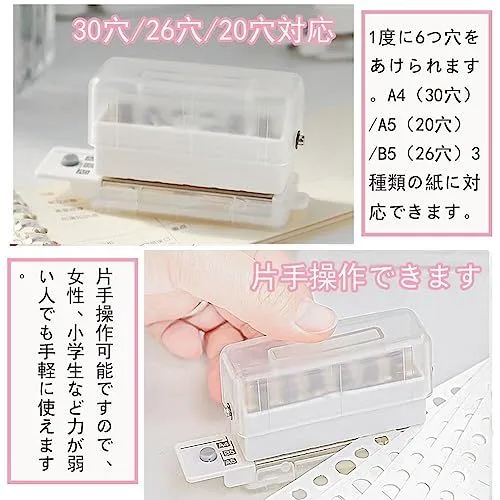 【A4/B5/A5ペーパーに対応可能】A4(30穴)/A5(20穴)/B5(26穴)3種類の紙に同時に対応できる穴あけパンチが新登場。使いやすくて、学生でも手軽に使えます。1度に6つ穴をあけられますので、使い楽々。コピー用紙やお気に入りのペーパーを、簡単にルーズリーフ仕様にできます。書類の整理に最適です。片手操作可能ですので、女性、小学生など力が弱い人でも手軽に使えます。