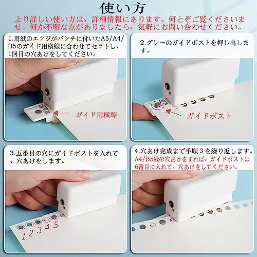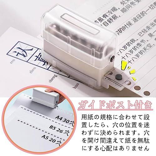 【用紙ガイド付き】A4・A5・B5用紙のガイド付きで、紙から簡単にルーズリーフが作れます。用紙の規格に合わせて設置したら、穴の位置を迷わずに決められます。穴を開け間違えて紙を無駄にする心配はありません, 紙を穴あけするのはより簡単になります。作業効率もアップします。パッケージにも取扱説明書が入っているので、ルーズリーフパンチの使い方を簡単に理解できます。