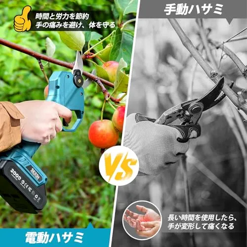 【ハイパワー&簡単切断 充電式剪定ばさみ】ブラシレスモーター搭載で強力なパワーを実現し、最大30mmの枝もスムーズかつ損傷なく切断可能です。滑り止め付きのポータブル設計で長時間の作業も快適。関節炎の方にも優しい使いやすい構造です。切断径は15mmと30mmの2モードを搭載し、起動時は30mmモード。電源ボタンで簡単に切り替えられます。※ご注意:引き金と電源ボタンの同時押しはお控えください。