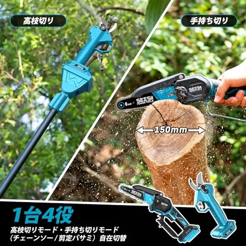 【2025年新型】SEESII たかえだ 電動チェーンソー 充電式剪定ばさみ ハンディチェーンソー 6インチ ブラシレス 高枝切り剪定ハサミ 1台4役 セット 強力 電動のこぎり 軽量 コードレス 延長ポール 125cm?250cm無段階調整 パワフル プ★m
