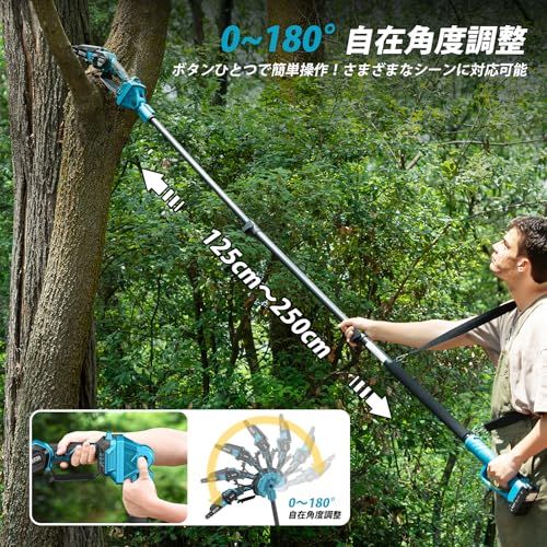 【1台4役 最新高枝チェーンソー&剪定ハサミ】1台で6インチチェーンソーと剪定ハサミの高枝切断・手持ち切断の4役をこなします。着脱式ポールで、手持ちモードと高枝モードを自在に切り替え可能。ポールは125cm250cmまで伸縮自在。最大約450cmの高さまで届きます。ヘッドは0180まで角度調整可能。安全かつ効率的に果樹、庭木、竹などの剪定に対応します。