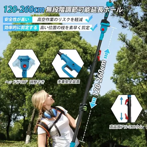 【高枝切り・電動チェーンソーと剪定ハサミの 1 台 4 役】高枝切り電動チェーンソーとたかえだ電動ハサミを自在に切り替え,高い所の枝も楽に切断できます。ポールを外すと、手持ちの 6 インチチェーンソーや電動ハサミとしても使え,低い木の枝も簡単に切断できます。作業環境やニーズに合わせて使えます。伸縮ポールは無段階で 125cm から 260cm まで伸ばせ、組み立てが完了すると、製品は最長290 cm、最大 580cm の動作範囲が可能で,作業がより安全かつ効率的に行えます。ヘッド部分も 0 - 180 自由に角度調整でき,枝切り作業がさらに楽になります。果樹、木材、竹、庭木の切断に最適です。