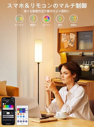 【スマホ&リモコンのマルチコントロール】専用アプリをスマホにダウンロードすればスマホがフロアライトのリモコンになる。ご家庭にWi-Fi環境がない場合や、スマホの操作が苦手な方でも問題ない。専用のリモコンを使うことで「調光・調色できるフロアランプ」として十分便利に活用できます。