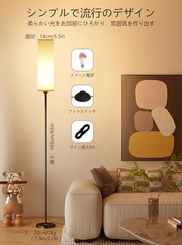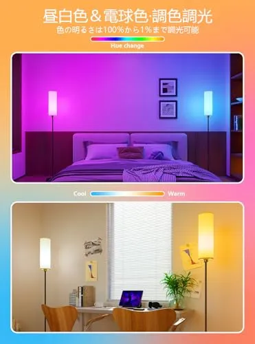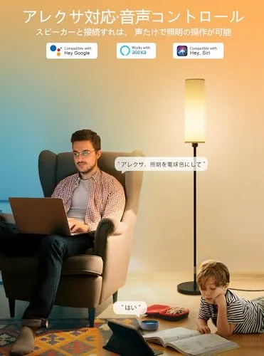 【音声操作】スマートスピーカーと接続すれは、声たけでフロアライトの操作が可能に。ライトのオン/オフのほか、明るさ、色温度、カラーも音声で調節可能。手が離せないとき、ハンズフリーで部屋の照明を音声操作しましょう。