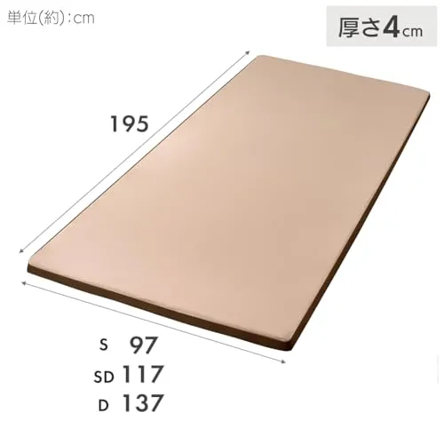 商品サイズ(cm):幅約97奥行約195高さ約8、商品質量:約4.91kg、目付け/ニット:約145g/m2/パイル:約170g/m2/メッシュ:約190g/m2、マットレスの硬さ/かため(149N)、復元率:約99% 主要材質/側生地:ポリエステル/詰めもの:ウレタンフォーム