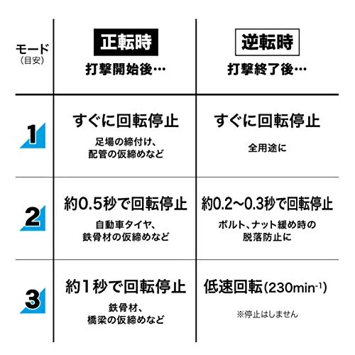 パワーと軽さを両立したミドルクラス。ハイパワーブラシレスモータ搭載。正逆転オートストップモード。連続した仮締め作業から、緩め作業時のナット落下防止に。(各3段階)スイッチ全速モード付。トリガを少し引けば、一気に全速回転。効率良く連続作業が行え、スイッチ操作の疲労も軽減。