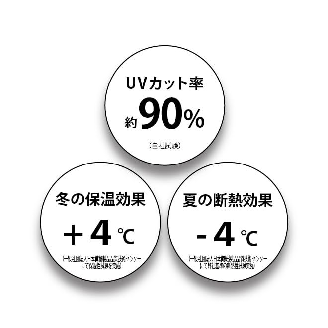 UVカット保温・断熱効果 嬉しいUVカット約90%。また冬は4、夏は?4の保温・断熱効果によって冷暖房効率を上げ、節電対策に繋がります。(冬の保温効果:一般社団法人日本繊維製品品質技術センターにて保温性試験を実施/夏の断熱効果:一般社団法人日本繊維製品品質技術センターにて弊社基準の断熱性試験実施)