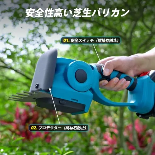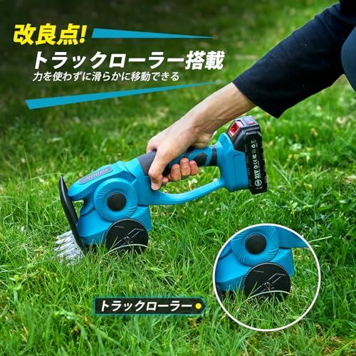 【一台 4 役 & 最新改良の芝生バリカン】改良点Elikliv の充電式ヘッジトリマーには、最大切断長 220mm、最大切断径7mm の生け垣剪定ブレードと最大トリミング幅 130mm の芝生剪定ブレードが装備されています。芝生バリカンと草刈機を自由に切り替えることができ、園芸剪定作業をより便利にすることができます。刃物交換は半工具レス生垣バリカンへチェンジ可能、トリマーブレードを装着すれば、植木の剪定も可能です。改良点この芝刈り機はトラックローラー付きで、操作が大幅に楽になり、力を使わずに滑らかに移動できるため、作業者の体力消耗を減らします。広い芝生で作業する際にも、位置や方向を簡単に調整でき、作業能率を向上させます。改良点プロテクターが搭載されており、跳ね石を防止して安全な作業環境を提供します。