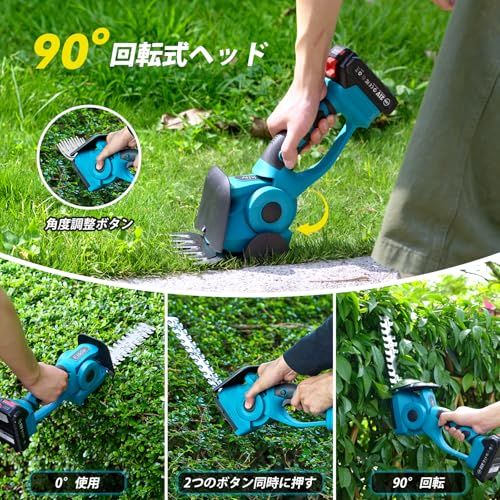 【調整可能刃と安全スイッチ】芝生バリカンの頭部は 0~90 度の回転が可能で、作業ニーズに応じて刃の角度を簡単に調整し、より良い剪定効果を得ることができます。電動芝刈り機を起動するには、スイッチボタンとセーフボタンを同時に押す必要があります。このデザインは意外な起動を巧みに防ぎ、安全性を高めています。