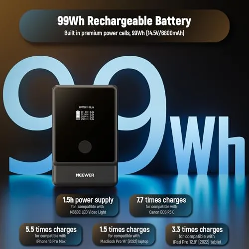 【NEEWER BASICSシリーズ】NEEWER BASICSシリーズは、シンプルで実用性に優れたシリーズで、基本的な機能と設計に基づいて、不要な追加機能や素材がありません。PS099Eは6800mAh 99WHの大容量で、EOS R5 Cに7.7回、iPhone 14 Proに5.8回、iPad Pro 12.9インチ(2022)タブレットに3.3回、MacBook Pro 14インチ(2022)ノートパソコンに1.5回、MS60C LEDビデオライトに1.5時間など、長時間のビデオ撮影に十分な電力を供給します。