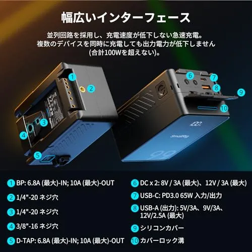 双方向PD 65W急速充電: SmallRig VB99 SE Vマウントバッテリーは超高速充電機能を誇り、幅広い急速充電プロトコル(PD3.0 / QC2.0 / QC3.0 / PPS / DCP-1.5A / APPLE-2.4Aなど)をサポートしています。最大65Wの高出力USB-C双方向PD急速充電/放電をサポートし、わずか2.5時間でバッテリーをフル充電できます。並列回路を採用し、充電が遅くなることなく急速充電します。複数のデバイスを同時に充電しても出力電力は低下しません(合計100Wを超えない)。