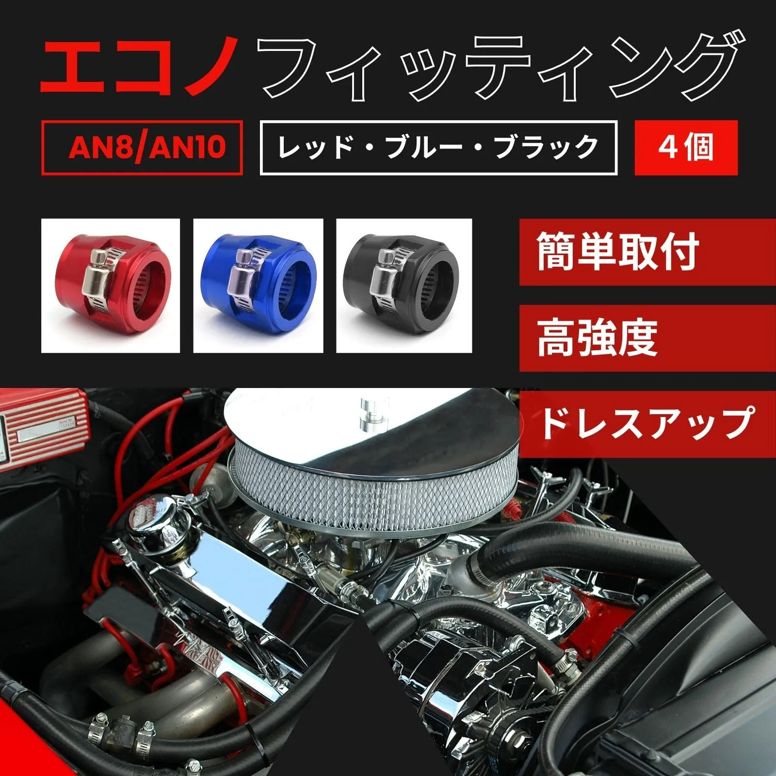 【商品仕様】エコノフィッティング4個セット サイズ:AN8(外径:17.8mm、内径:12.8mm)、AN10(外径:20.5mm、内径:15.4mm) 材質:アルミ合金。 カラー:レッド、ブラック、ブルー エコノフィッティングは、あなたの車のパフォーマンスと見た目を一新し、さらなる満足感を提供します。今すぐこの高品質なフィッティングを手に入れて、最高のカーライフを楽しんでください。