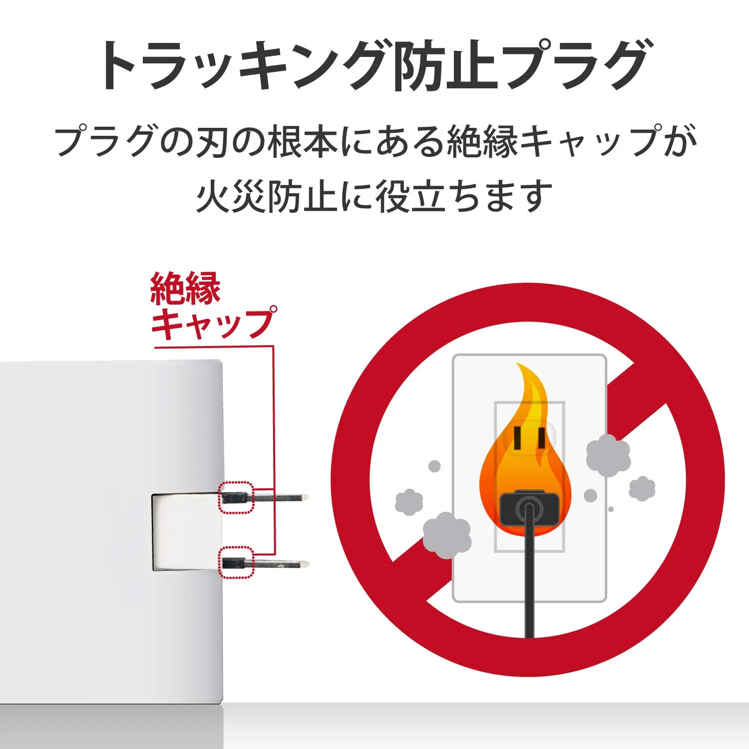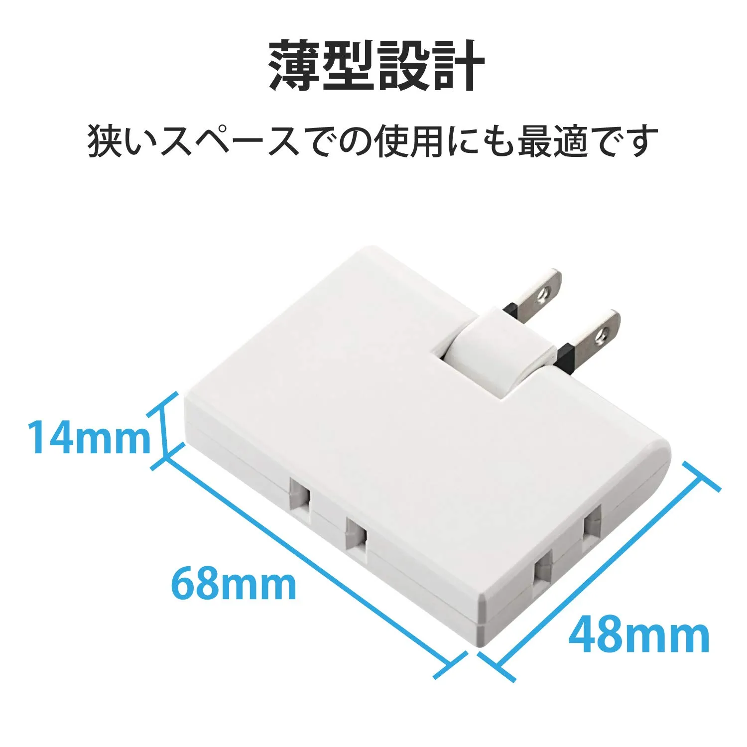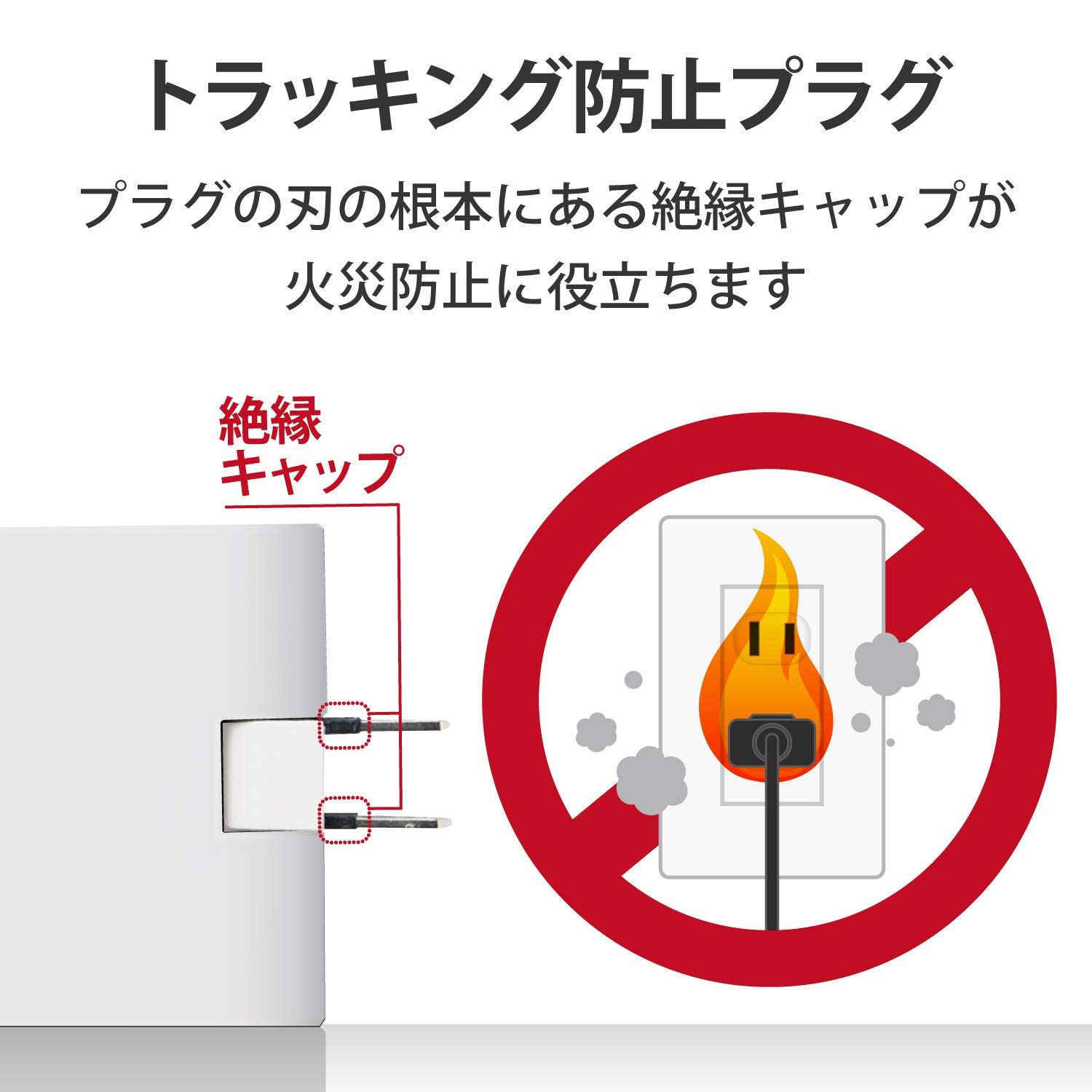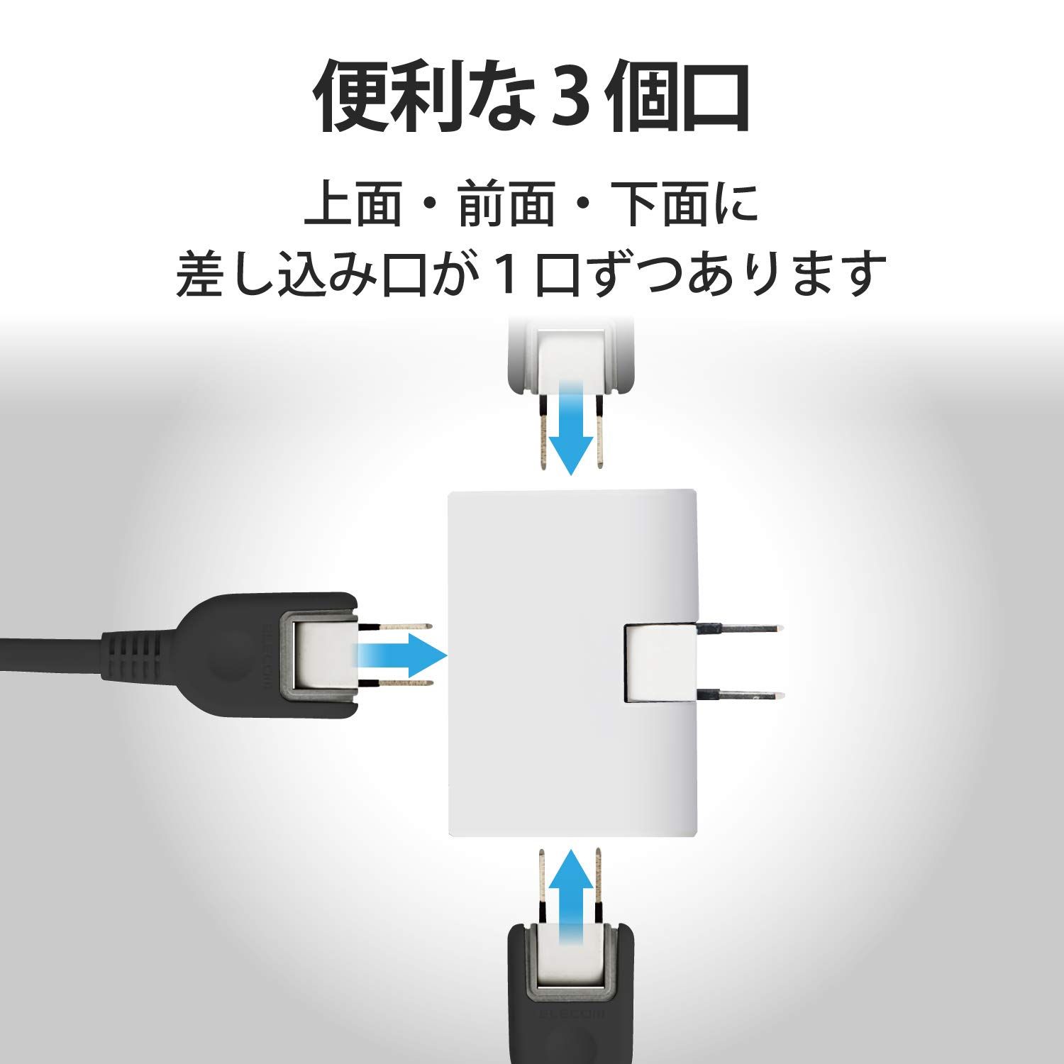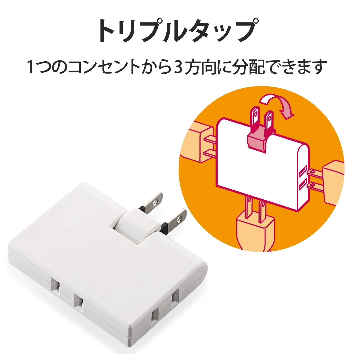 耐熱性に優れたユリア樹脂を使用。1つのコンセントから3口に電源を分配することができるトリプルタップ。1つのコンセントから3口に電源を分配することができるトリプルタップです。薄型タイプなので狭いスペースでの使用にも適しています。狭い場所でも配線しやすい180°スイングプラグを採用しています。プラグの刃の根元に絶縁キャップが付いており、トラッキング現象による火災の防止に役立ちます。耐熱性に優れたユリア樹脂を使用していますので、万一の発熱の際にも融解しにくく、電気火災の防止に有効です。左右下の側面に差し込み口が1口ずつあります。製品の包装容器におけるプラスチック重量を、社内基準製品より20%以上削減した製品です。製品の包装容器が紙・ダンボール・ポリ袋のみで構成されている製品です。