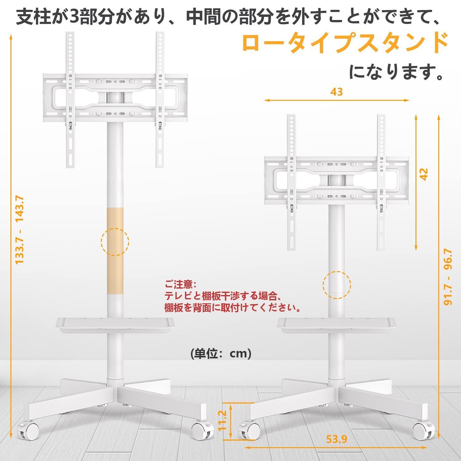 高さ調整、ラック傾斜:tvスタンドのラックが3段階の高さ調整可能、上向き5°下向き2°に傾き、画面を見やすい角度に設置可能です。特別な設計としてスタンドの支柱が3部分があり、中間の部分を外すると、ロータイプスタンドになって、床に座っても高さもぴったりです。また、壁寄せテレビスタンドの棚板も自由に調節可能で、ゲーム機やレコーダーやHDDなどAV装置も収納できています。
