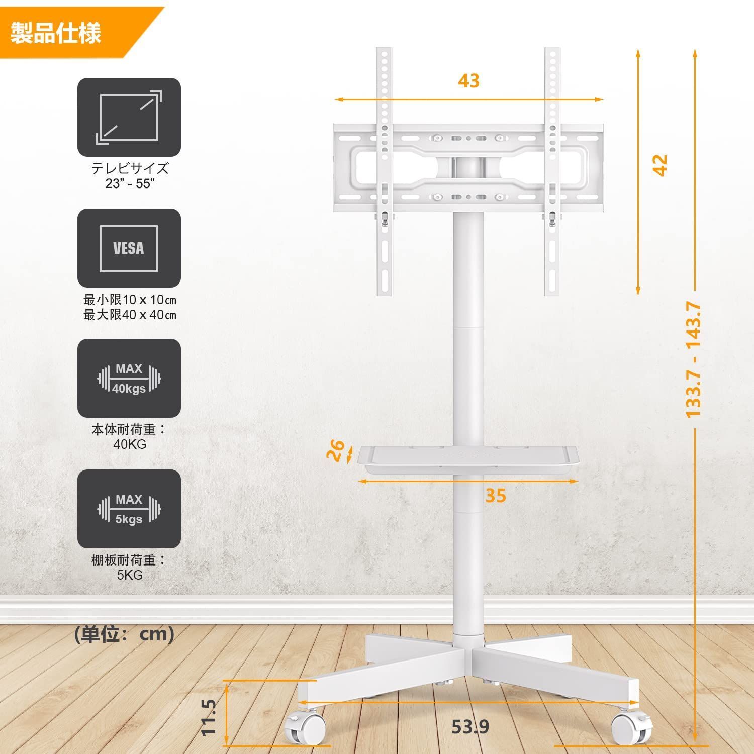 VESA対応:テレビスタンドのVESAは(テレビ背面のネジ穴間の距離)100x100 mmから400x400 mmまで対応可能です。このキャスター付きテレビスタンドが23から50インチまでのテレビやモニターの大部分に対応しています。本体耐荷重:40 KG、棚板耐荷重:5 KG