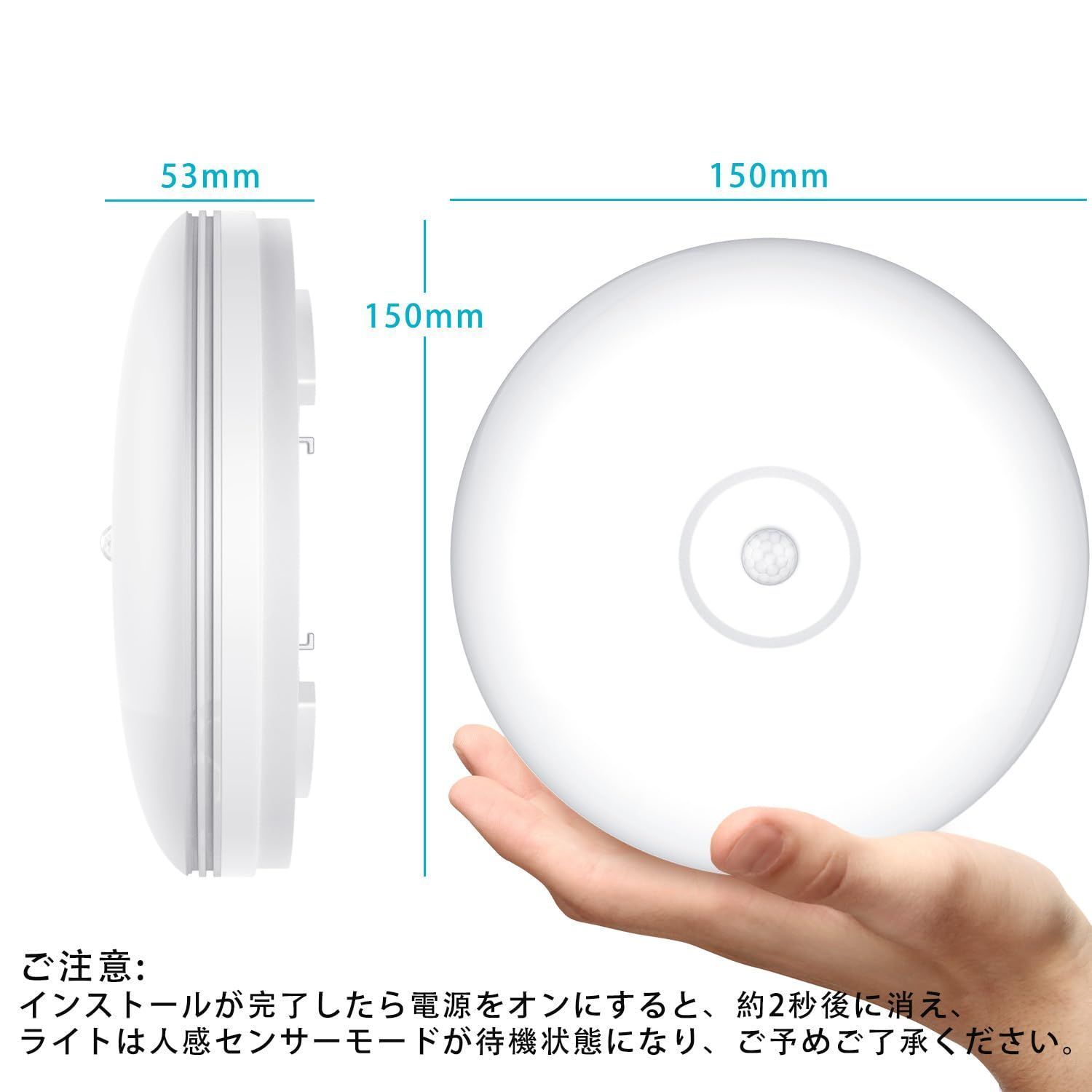 【ご注意:初期設定が完了したら、スイッチをオンにすると、約2秒後にライトが消灯になります。 この機能は灯具が正しく設定されるため、その後人感センサーモードが待機状態になります。スイッチが常にオンになるようにご確認してください。】 約40000時間(約5年)交換不要、点灯時の消費電力は10Wで蛍光灯の約半分、節電・節約につながります。なお、消灯時の待機電力は約0.65W、待機電力にかかる電気料は年間で約140円です。 小型シーリングライトのサイズは直径約150mm、厚さ53mmなので、コンパクトで設置が簡単です。