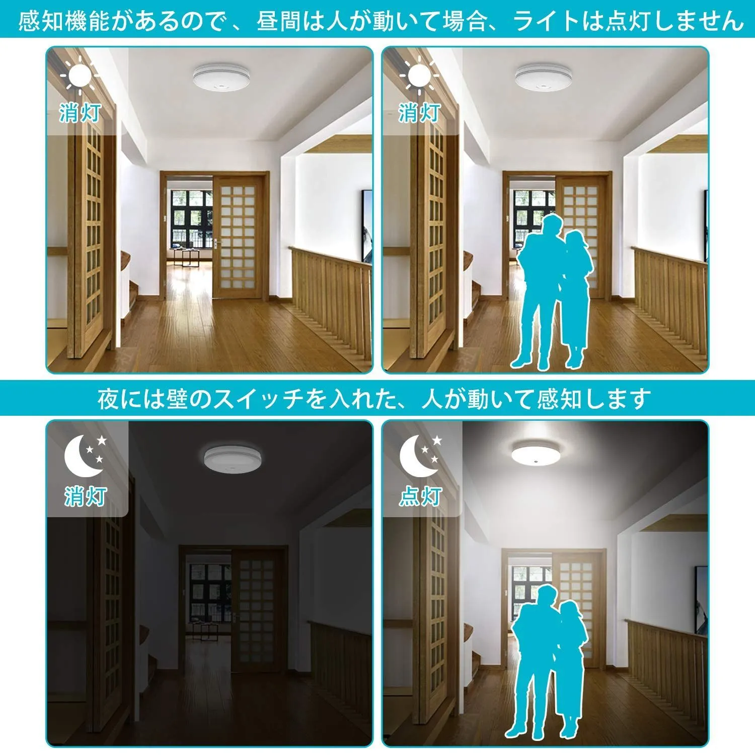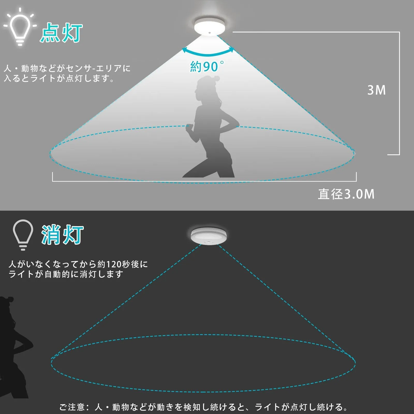 人感センサーライトの検知距離は約3M。感知機能があり 、昼間は人が動いて場合、ライトは点灯しません。夜には壁のスイッチを入れた、人が動いて感知します。 人がいなくなってから120秒後にライトが自動的に消えます。