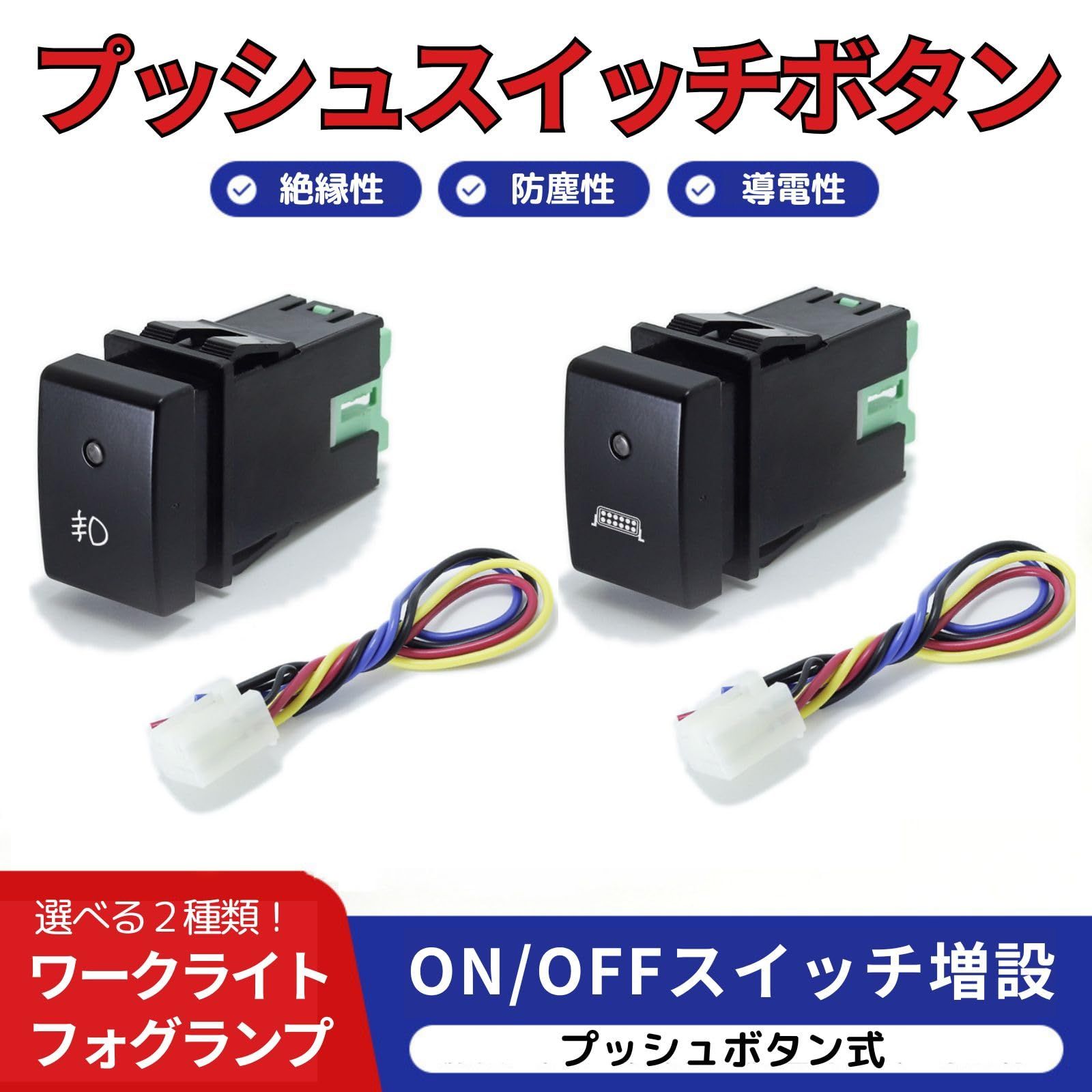 ◆スズキジムニー用プッシュスイッチ:この高品質プッシュスイッチは、スズキジムニーのワークライトとフォグランプに対応。純正品と交換しても違和感なく、簡単に後付けできるビルトイン・埋め込み式です。