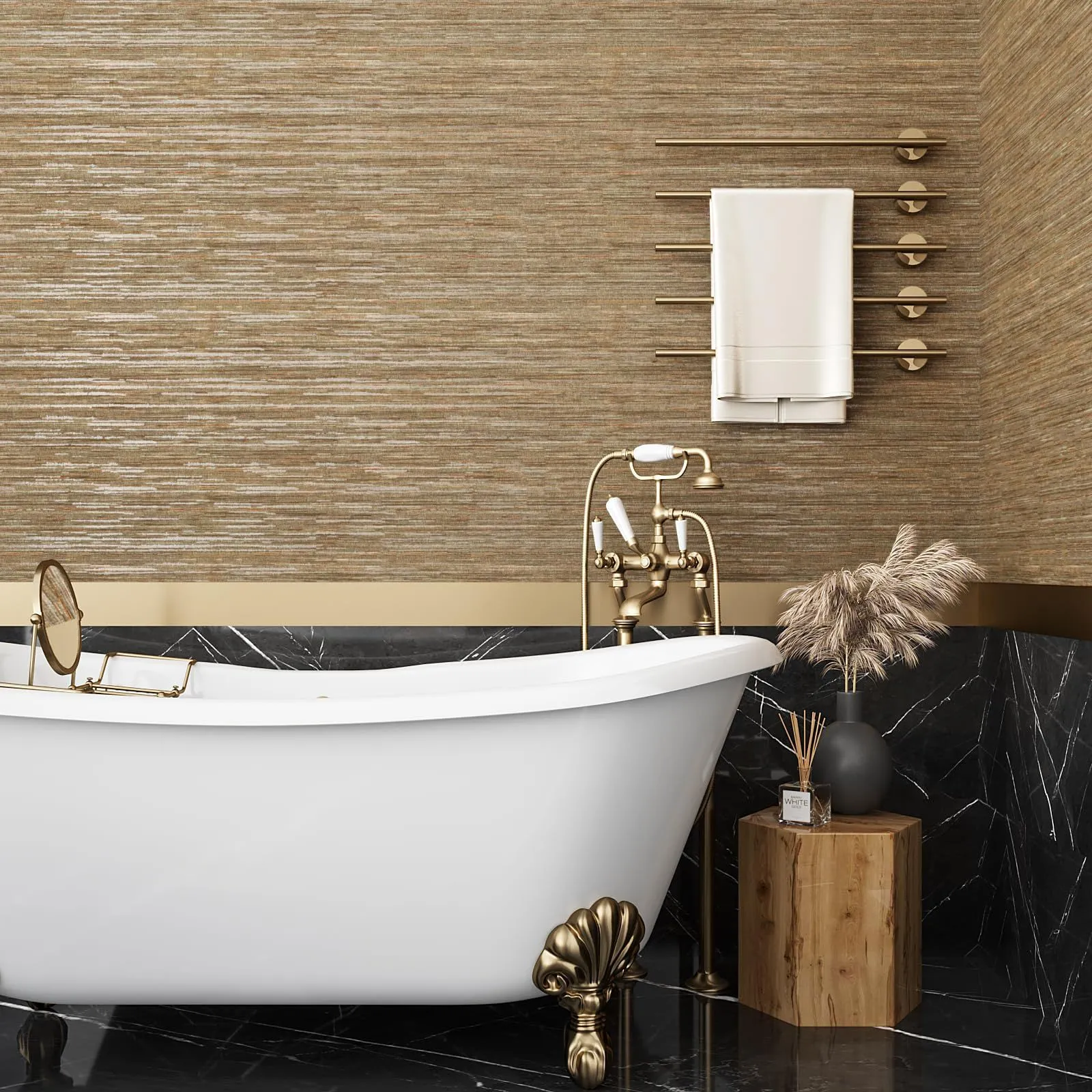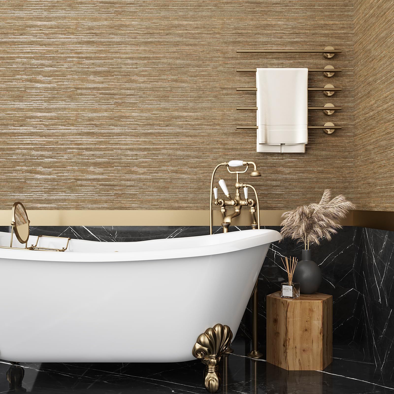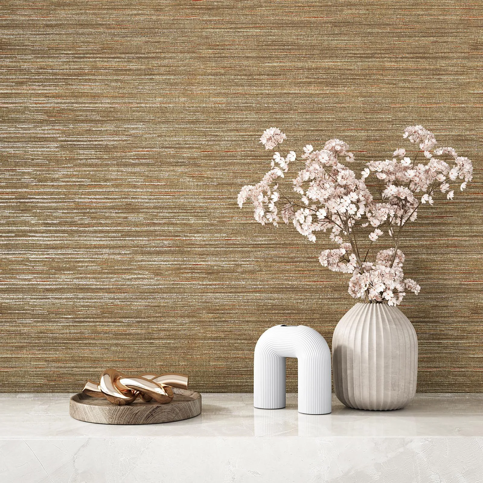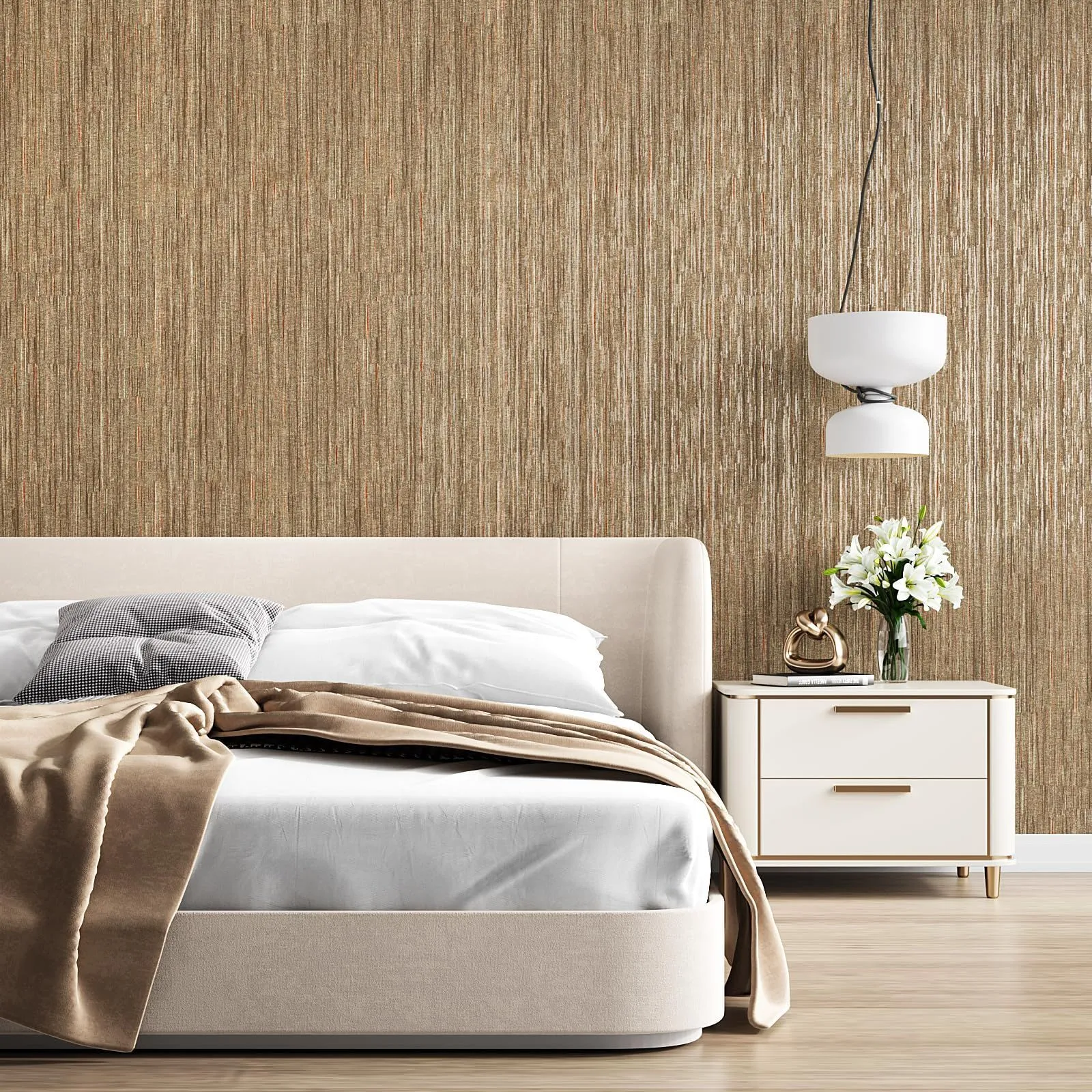 【温かみあるタテ糸織物調】:キメ細かいシルクのような織物模様をイメージした壁紙です。表面にはエンボス加工があり、照明に当たると凹凸の影がつきやすく、まるで本物の織物調みたい。高級感溢れる色合いは空間に重厚でビンテージなイメージを与えてくれます。お部屋を優しく、明るく飾ってくれます。